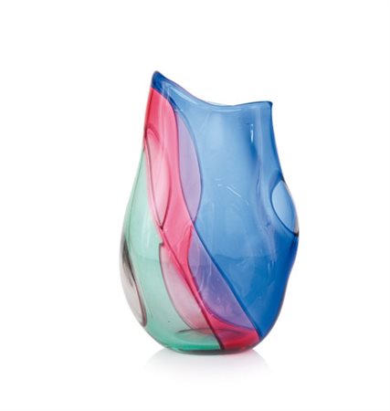 VASO "CARNEVALE" IN VETRO A TRIPLO INCALMO, A.SEGUSO, 1990 CA., sagomato a tre colori.