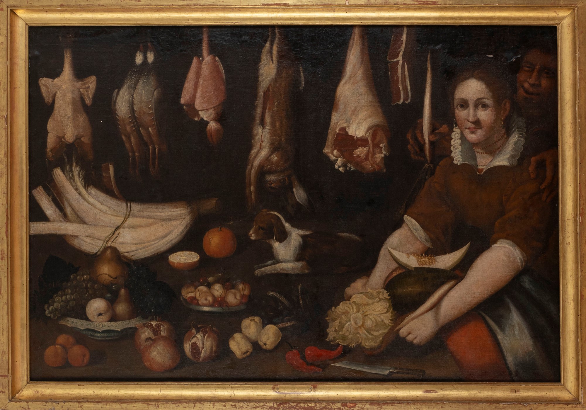 Il dipinto offerto nel lotto può essere riferito ad un pittore attivo in Toscana nella prima metà del secolo XVII, vicino per stile e soggetti a Jacopo da Empoli (Firenze 1551 - 1640), Andrea Commodi (Firenze 1560 - 1638) e Astolfo Petrazzi (Siena 1580 - 1653). Nella produzione di questi pittori si ritrovano infatti composizioni simili a quella del dipinto qui presentato, con un interno di cucina in cui la natura morta di carni appese e di frutti esposti sul tavolo viene arricchita della presenza di figure umane, a volte, come in questo caso, rese con realismo quasi caricaturale (cfr. La natura morta in Italia, Milano 1989, tomo II, pp. 532-538 e pp. 541-543).