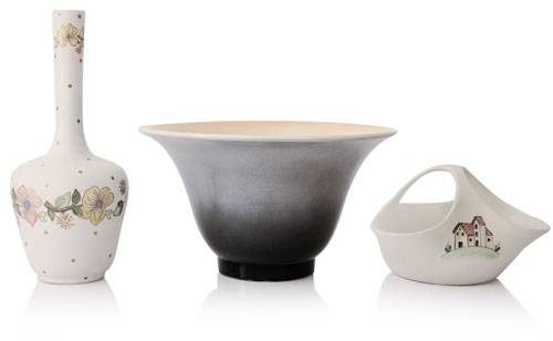COPPA IN CERAMICA, LENCI, M.STURANI, 1935, UN CESTINO ED UNA BOTTIGLIA IN CERAMICA, LENCI, ANNI '50, coppa color grigio e giallo sfumati, cestino