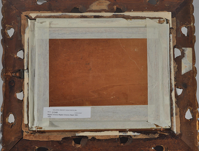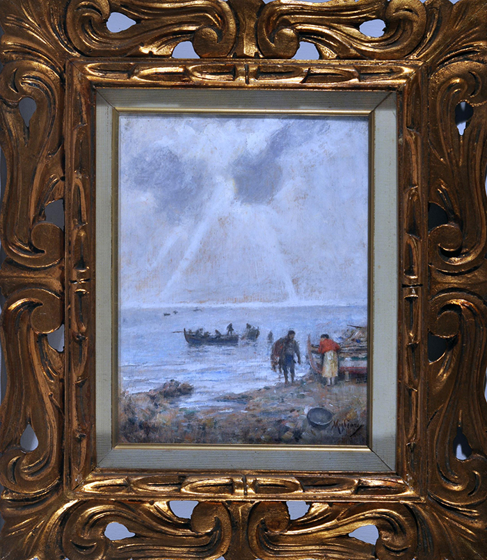 Migliaro Vincenzo (Napoli 1858 - 1938) In riva al mare olio su tavola, cm 26x20 firmato in basso a destra: Migliaro