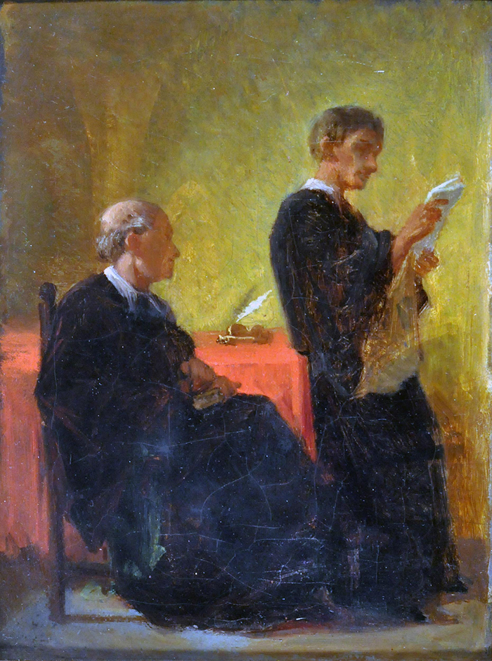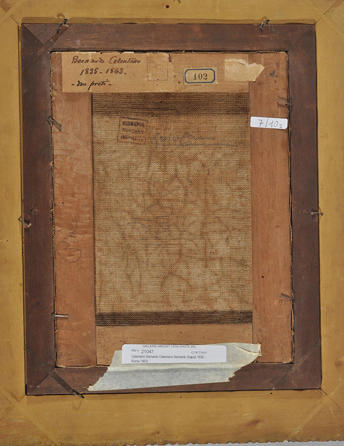Celentano Bernardo (Napoli 1835 - Roma 1863) Preti olio su tela, cm 30x23 a tergo iscritto: Bernardo Celentano Provenienza: Coll. Casciaro, Napoli; Coll. rivata, Napoli Esposizioni: Torino, 1929; Firenze, 1942 Bibliografia: Società Belle Arti Antonio Fontanesi -Mostra degli Ottocentisti napoleatani,Ed. Gall. Codebò Torino 1929; I Pittori napoletani dell'800 e di altre scuole nella "Raccolta Casciaro" Gall. d'arte Ass. Nazionale degli artisti Firenze 1942 n° cat. 45