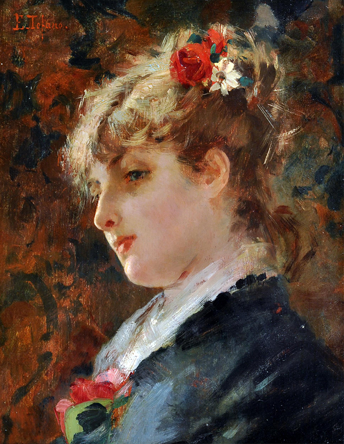 Tofano Edoardo (Napoli 1838 - Roma 1920) Profilo femminile olio su tavola, cm 24x18,5 firmato in alto a sinistra: E. Tofano