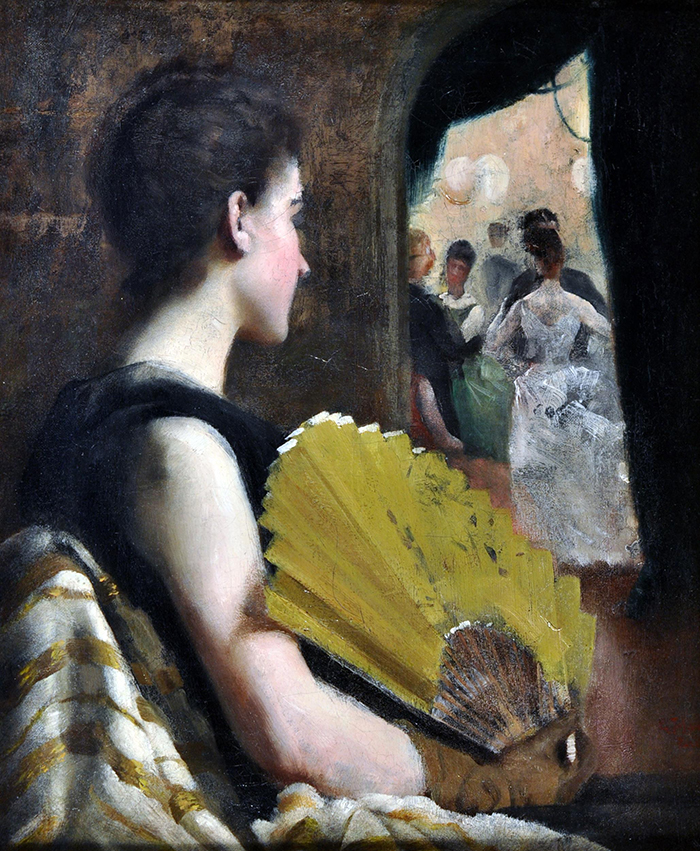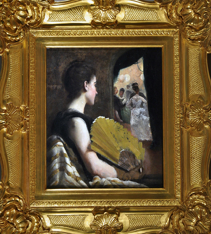 Tofano Edoardo (Napoli 1838 - Roma 1920) Al ballo olio su tela, cm 46x38 firmato in basso a destra: E. Tofano A tergo impresso sul telaio il numero 8; antico talloncino di carta con il n.55; sulla tela due timbri ad inchiostro indecifrabili con firma di antico possessore Provenienza: Coll. Biagio D’Angelo, Napoli; Coll. privata, Napoli.