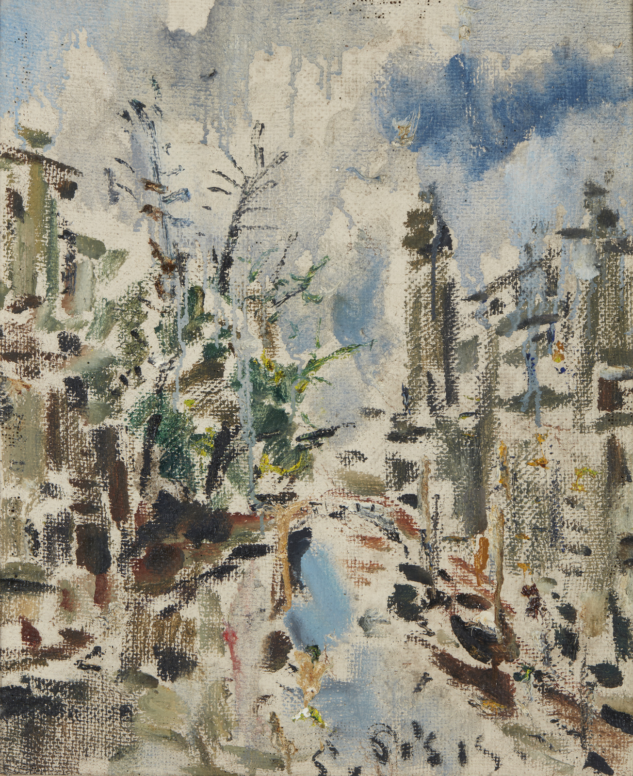 DE PISIS FILIPPO (1896 - 1956) Canale di Venezia. Olio su tela . Cm 53,50 x 63,50. Firma in basso a destra. Al retro etichetta e timbri Galleria d'arte Pinacoteca, Roma. Opera archiviata presso l'Associazione per il Patrocinio delle opere di Filippo De Pisis, come da documentazione fotografica allegata all'opera riportante il relativo numero d'inventario. Lievi difetti. Cornice presente