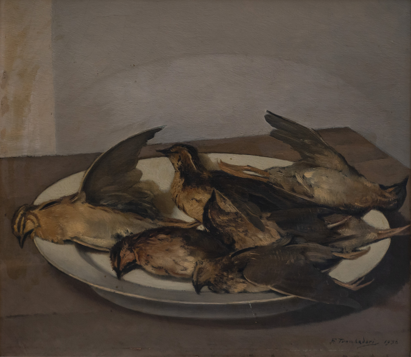 TROMBADORI FRANCESCO (1886 - 1961) Caccia. 1936. Olio su tela . Cm 41,00 x 38,00. Firma in basso a destra. Autentica di Donatella Trombadori su fotografia, Museo Francesco Trombadori, Roma. Provenienza: Collezione privata, Roma. Cornice presente