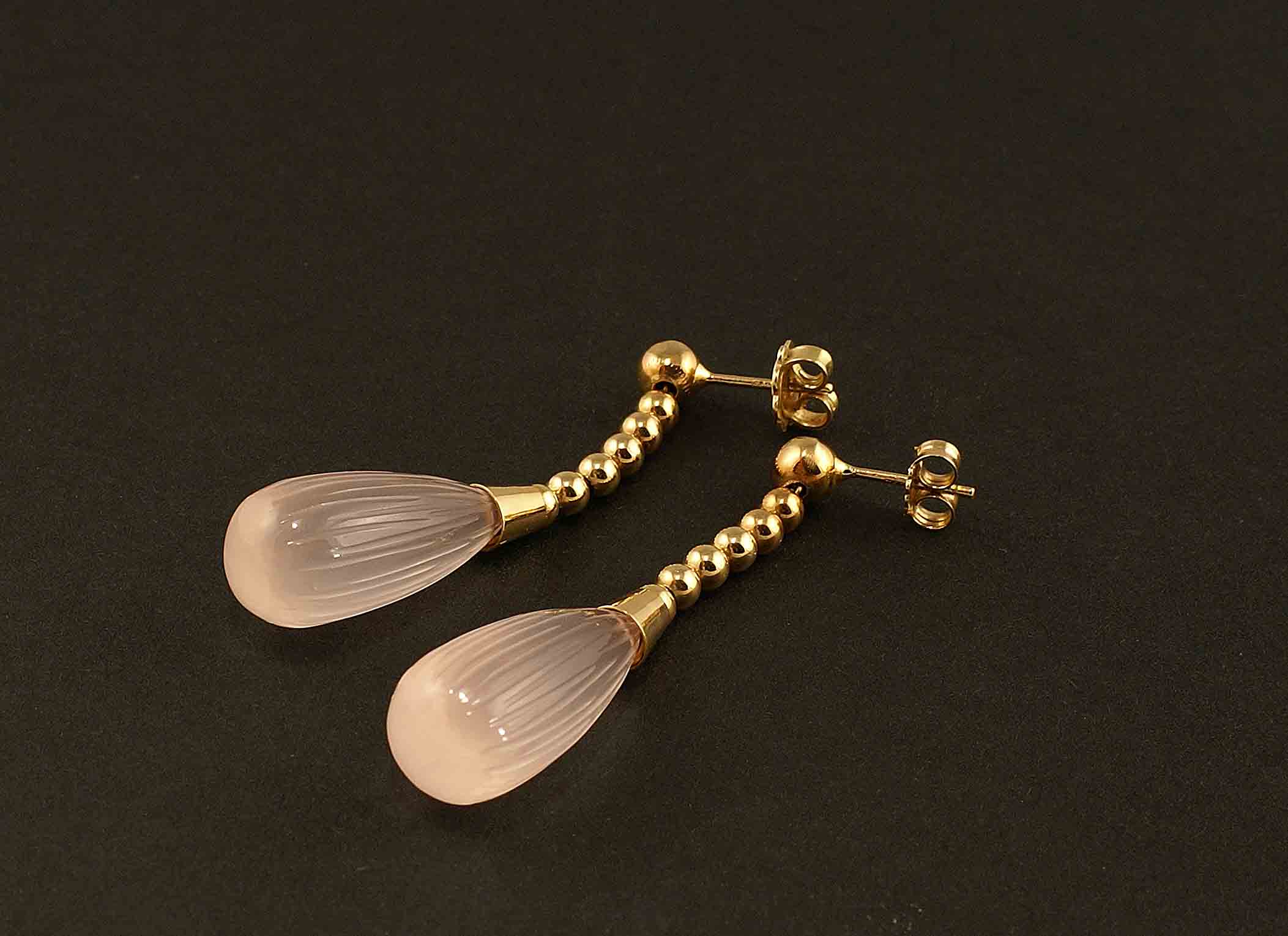 Orecchini pendenti in oro giallo 18kt con incastonate due gocce in quarzo rosa, gr. 10,2.