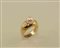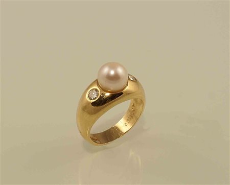 Anello in oro giallo 14kt con incastonata al centro una perla coltivata di mm. 8 circa con ai lati due diamanti taglio brillante per 0,20 punti circa, gr. 7,5.