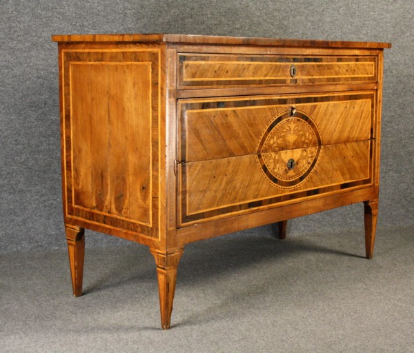 Firmato, datato. Cassettone Luigi XVI tre cassetti latronato e filettato in legni vari con al centro un medaglione raff. ''VASO DI FIORI''. Difetti. Mis. Lung. cm. 120 Alt. cm. 86 Prof. cm. 54 ca.