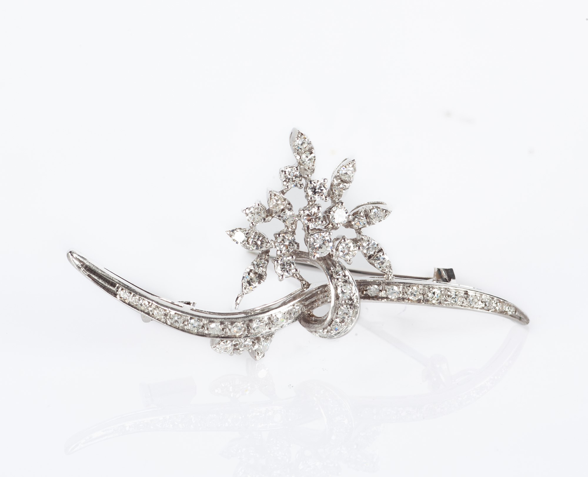 Spilla in oro e brillanti cm 5x3 Oro bianco 750/000. Diamanti in taglio rotondo brillante ct 0,50 ca. Peso complessivo gr.6,20
