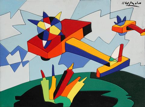 NESPOLO Ugo Mosso Santa Maria (Bi) 1941 Incontro al sole, 1987 acrilico su legno ritagliato cm. 30 x 40 Firma 'Nespolo' (in alto a destra) #Titolo, tecnica, misure 'Incontro al sole, legno/acrilico, cm 30x40'; #timbro dell'artista (al retro) Autentica dell'artista su fotografia Bibliografia: 'Da Picasso a Botero', Ed. Torcular, 2004, p. 256