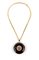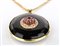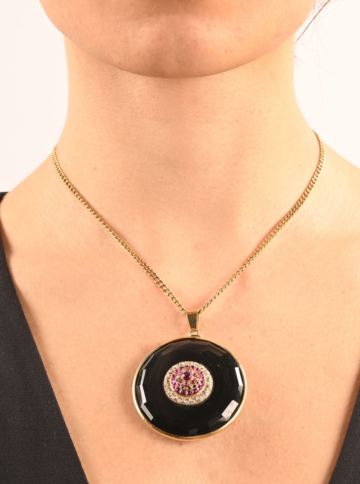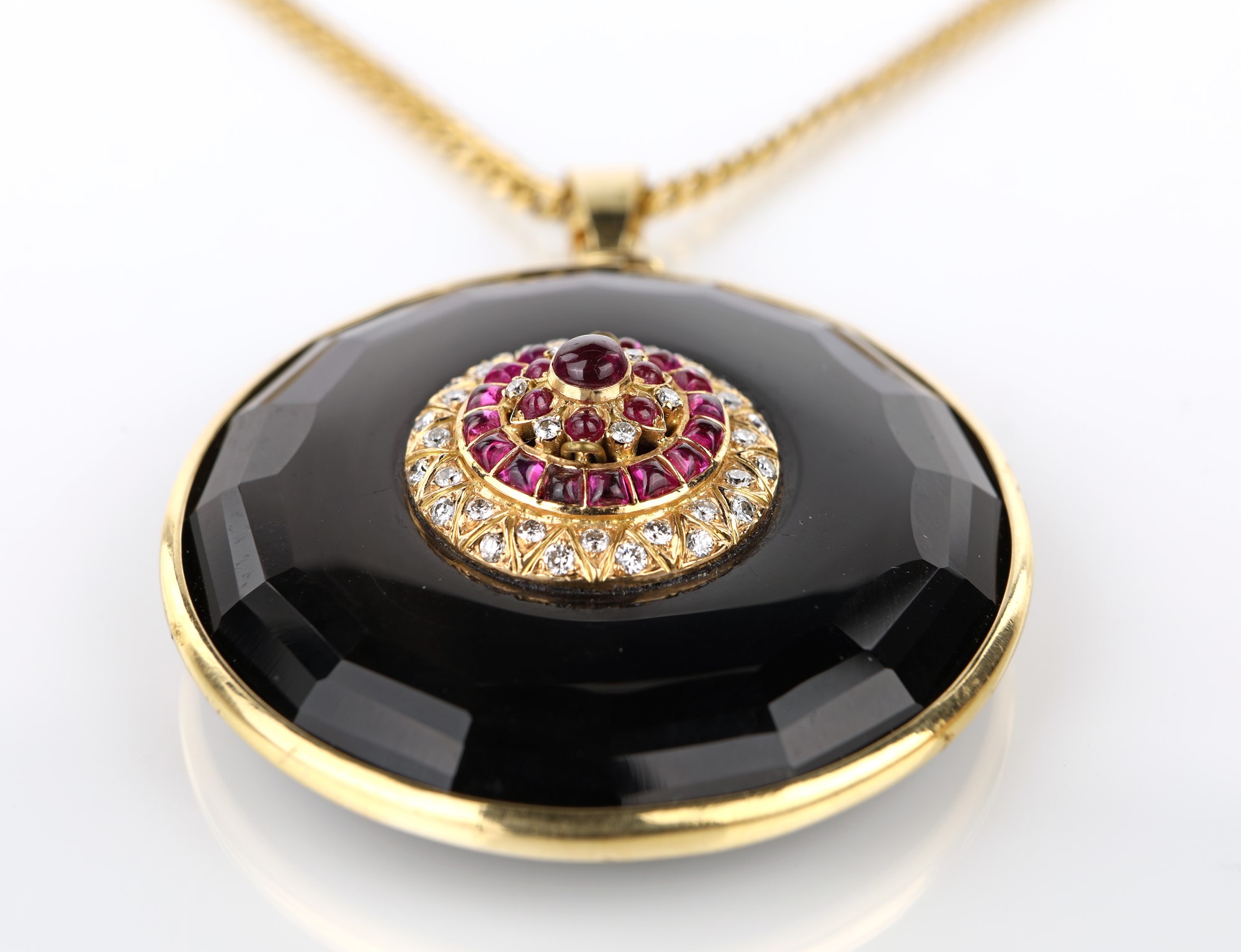 Pendente in oro, brillanti, rubini e ossidiana Lunghezza cm 40. Diametro mm 5 Oro giallo 750/000. Diamanti in taglio rotondo brillante, rubini in taglio cabochon e ossidiana. Peso gr 47,90