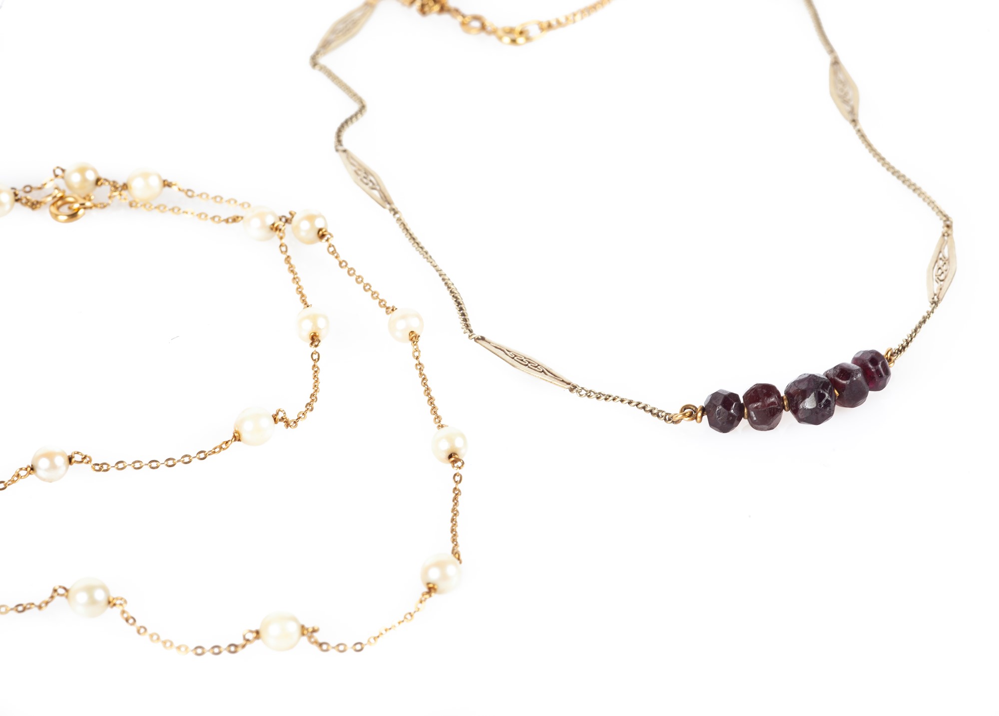Coppia di collane in oro perle e granati. Lunghezza cm. 60 perle/ cm 37 granati Oro giallo 750/000. Perle coltivate, granati taglio briolet. Peso complessivo gr. 13,50.