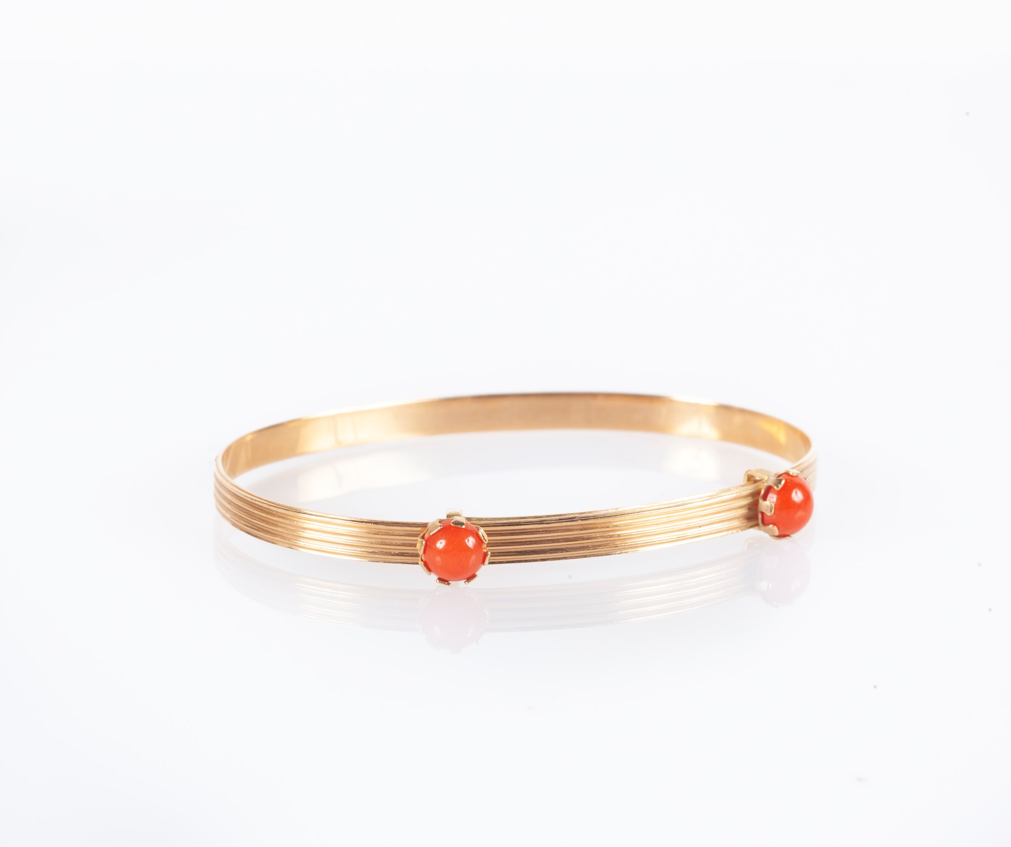 Bracciale rigido in oro con 2 sfere in corallo Veste polso cm 13 Oro giallo 750/000. Peso complessivo gr. 6