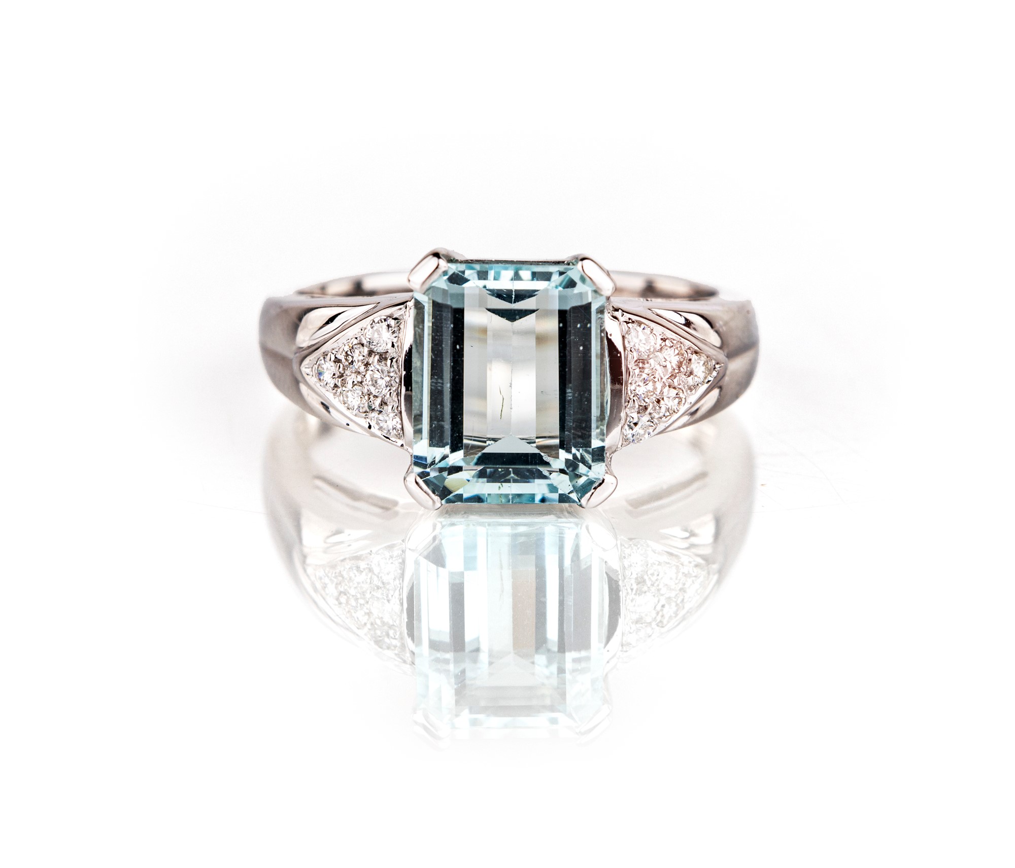 Anello in oro acquamarina e brillanti Misura 17 Oro bianco 750/000. Acquamarina ct. 3 ca. Peso complessivo gr. 6,30