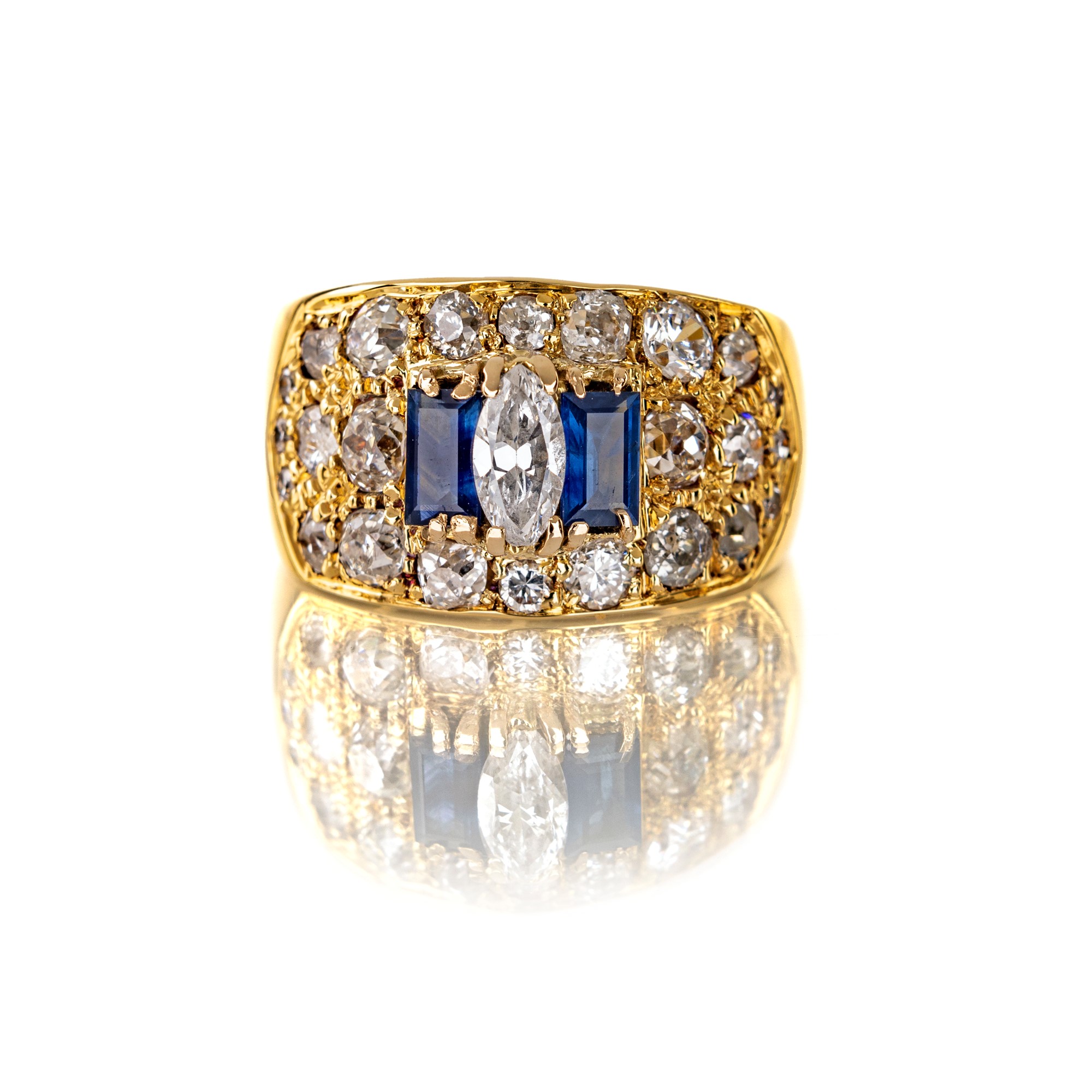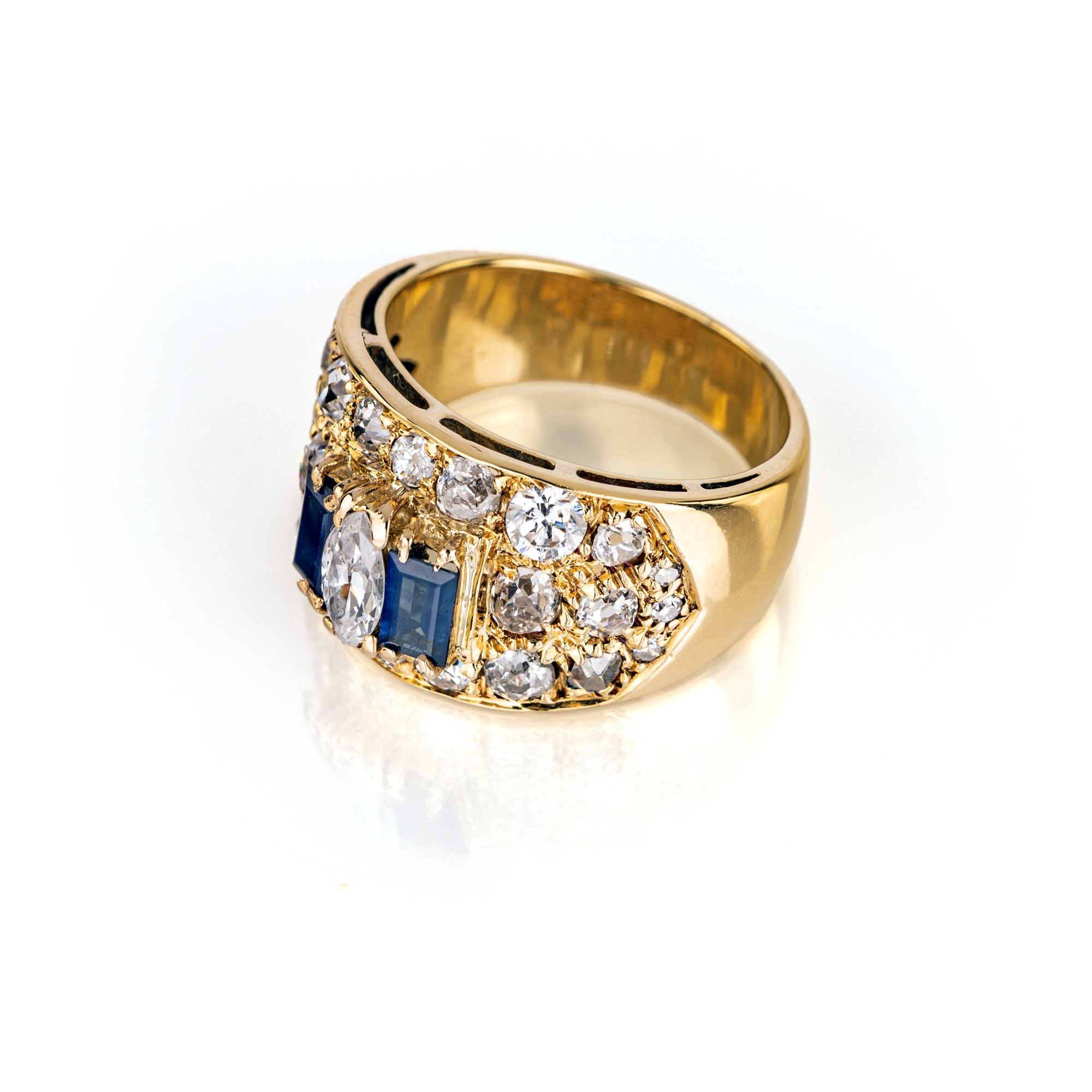 anello a fascia in oro brillanti e zaffiri Oro giallo 750/000. Diamanti in taglio rotondo brillante e navette ct. 2 ca, zaffiri. Peso complessivo gr. 9,70