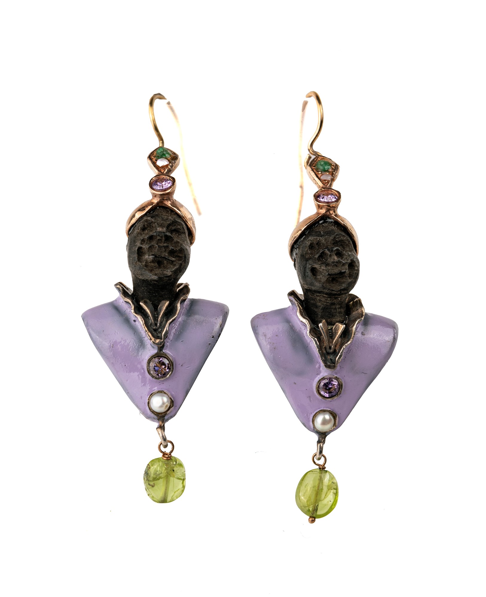 Lotto 155 | Coppia di orecchini moretti in oro, smalto, diamanti e pietre.