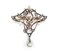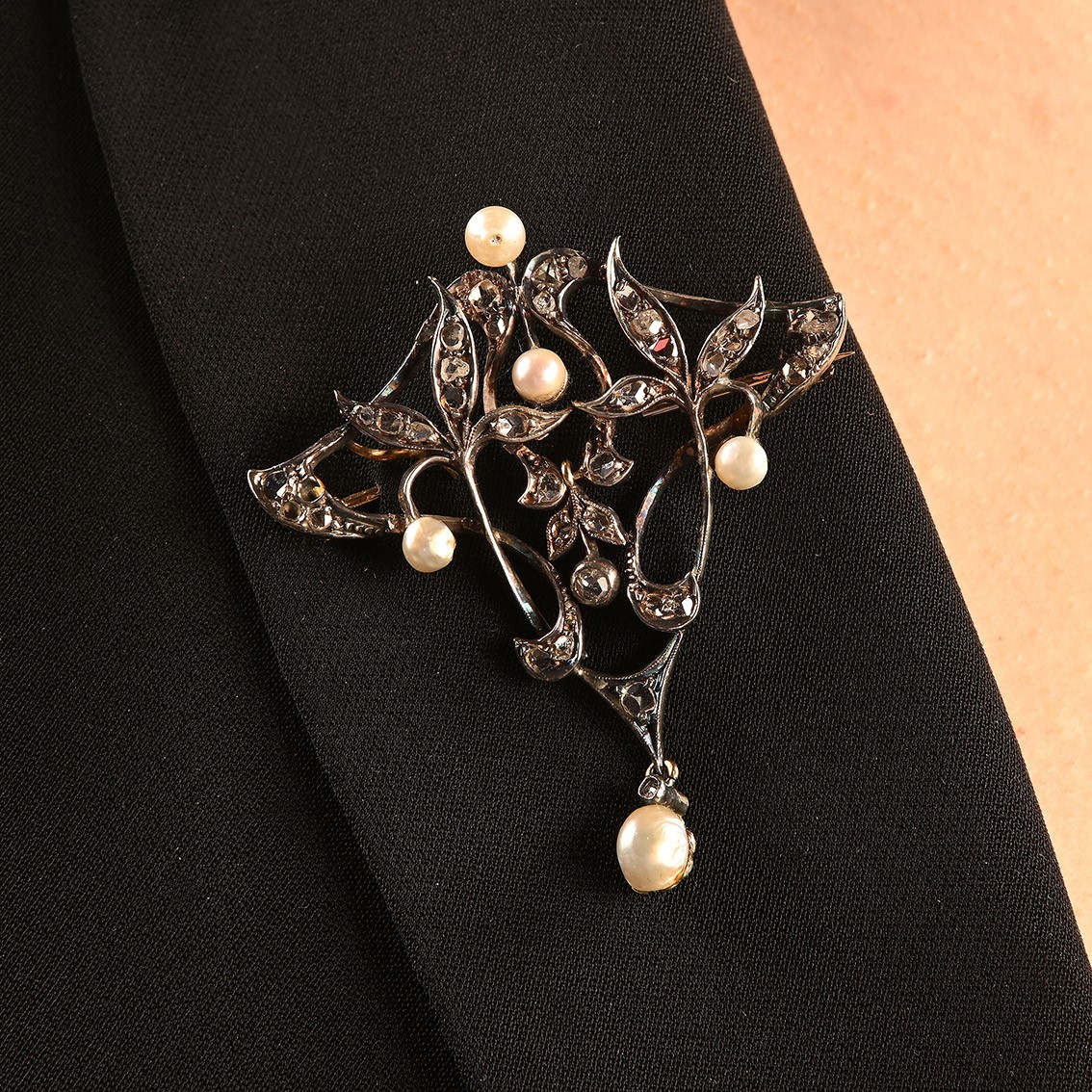 Spilla in oro, argento, diamanti e perle Oro a basso titolo, argento, diamanti in taglio rosa, perle. Peso complessivo gr. 12. Primi '900