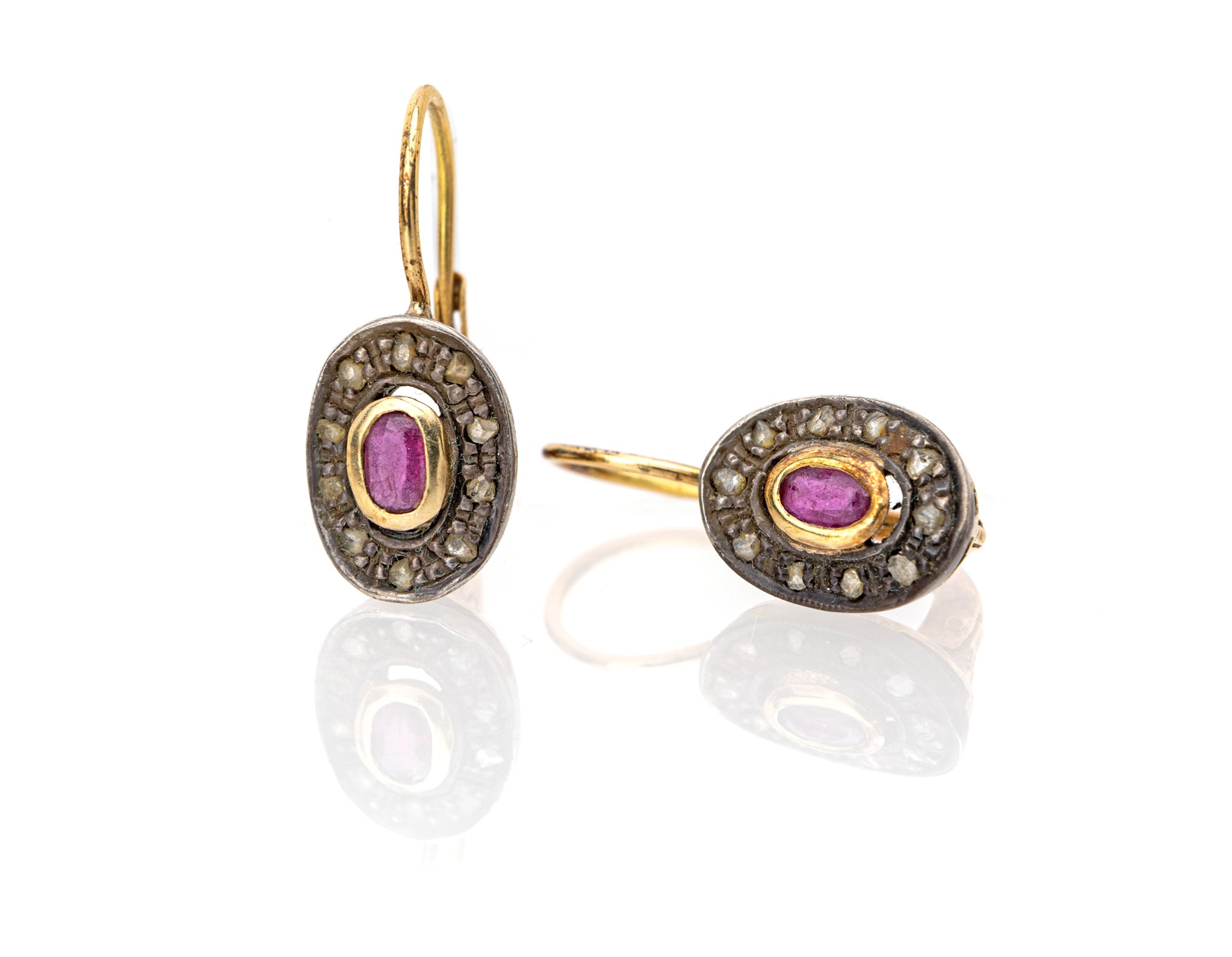 Coppia di orecchini in oro, argento, diamanti e rubini