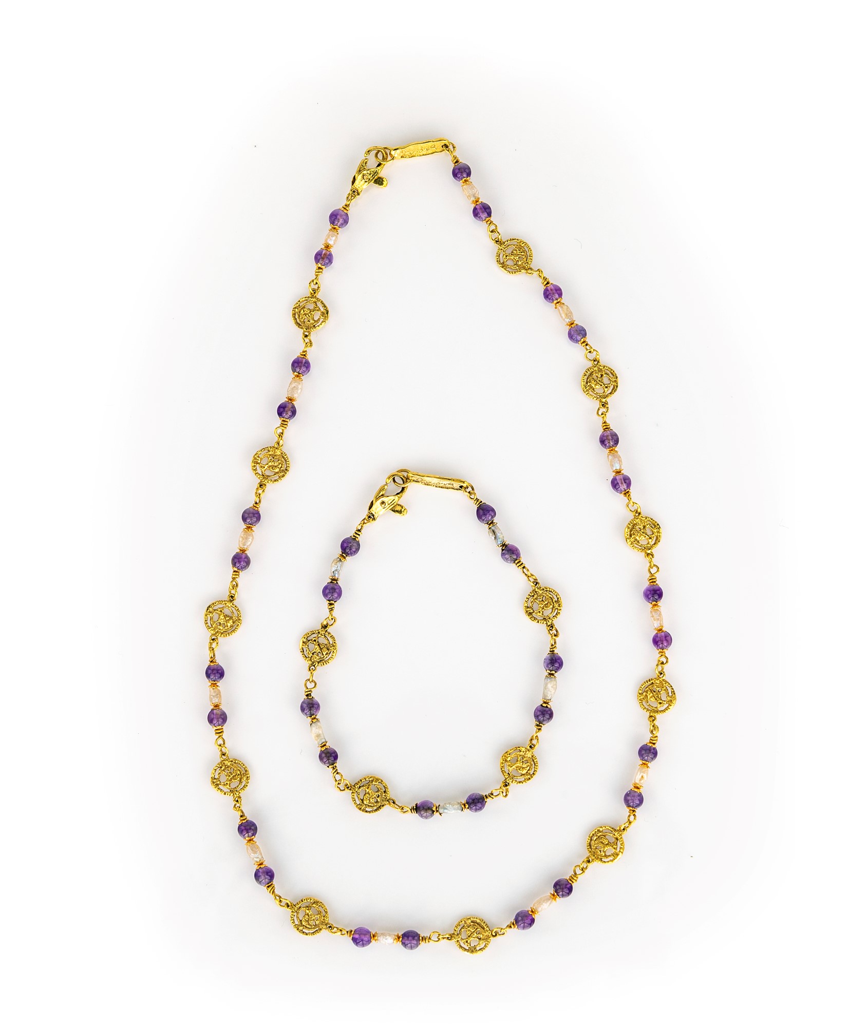 Lotto 204 | Girocollo e bracciale in oro, ametiste e perle