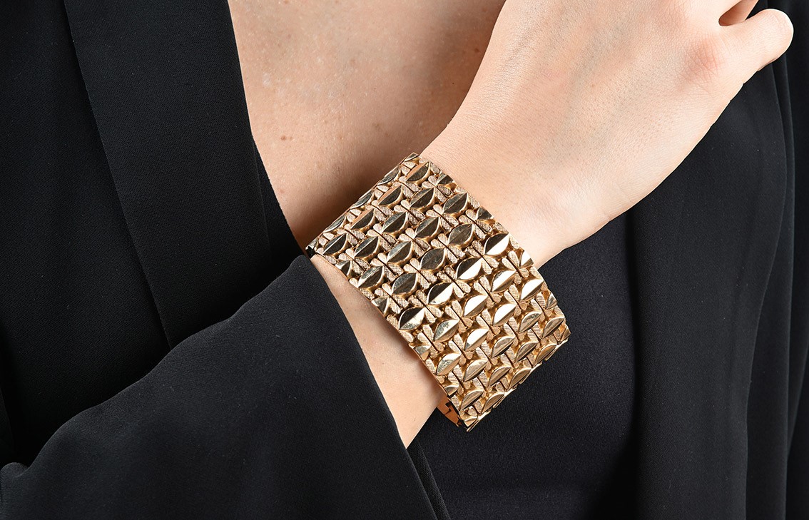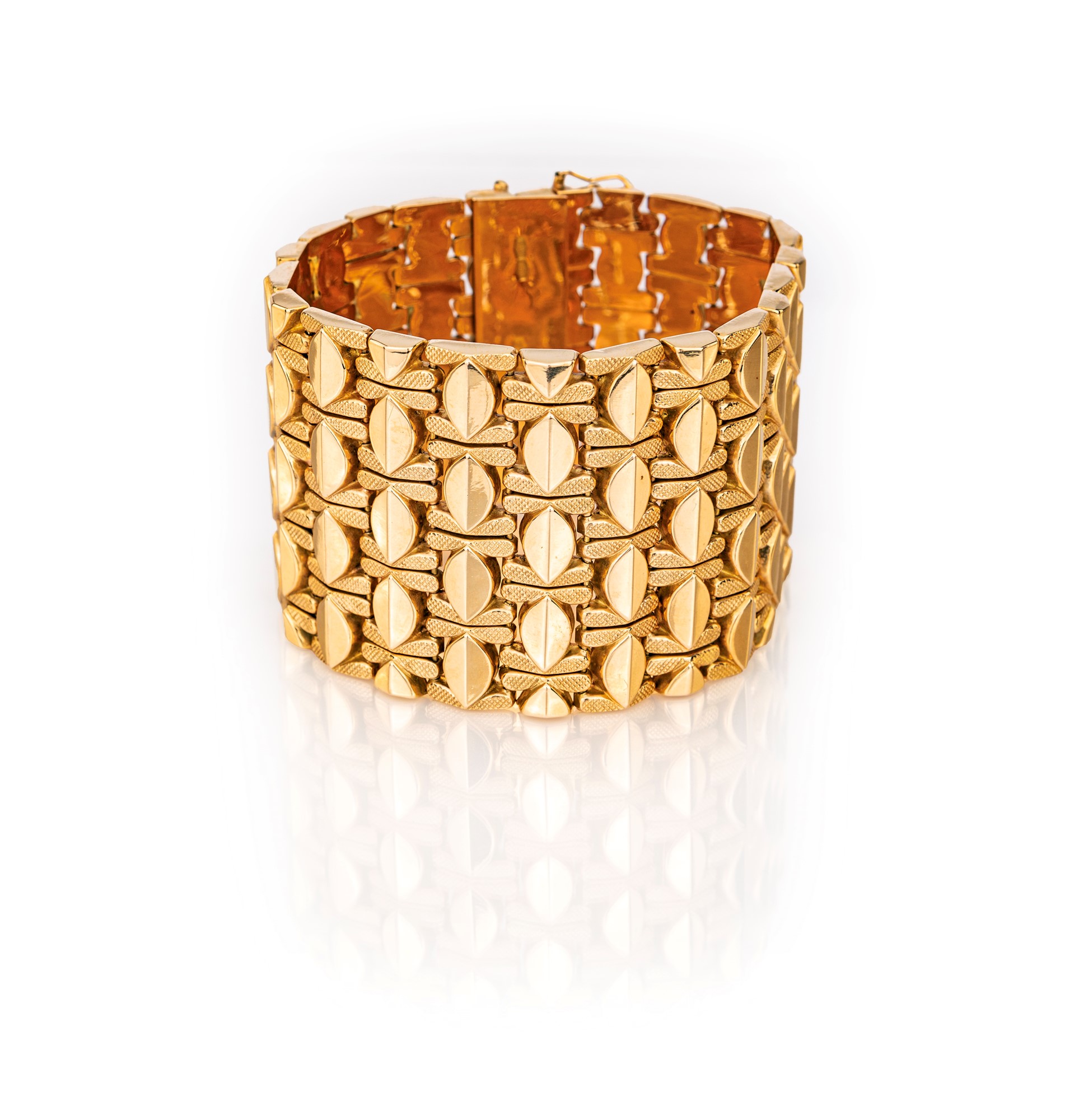 Bracciale in oro Lunghezza cm 19, altezza cm 4,5 Oro giallo 750/000. Peso complessivo gr. 85,20