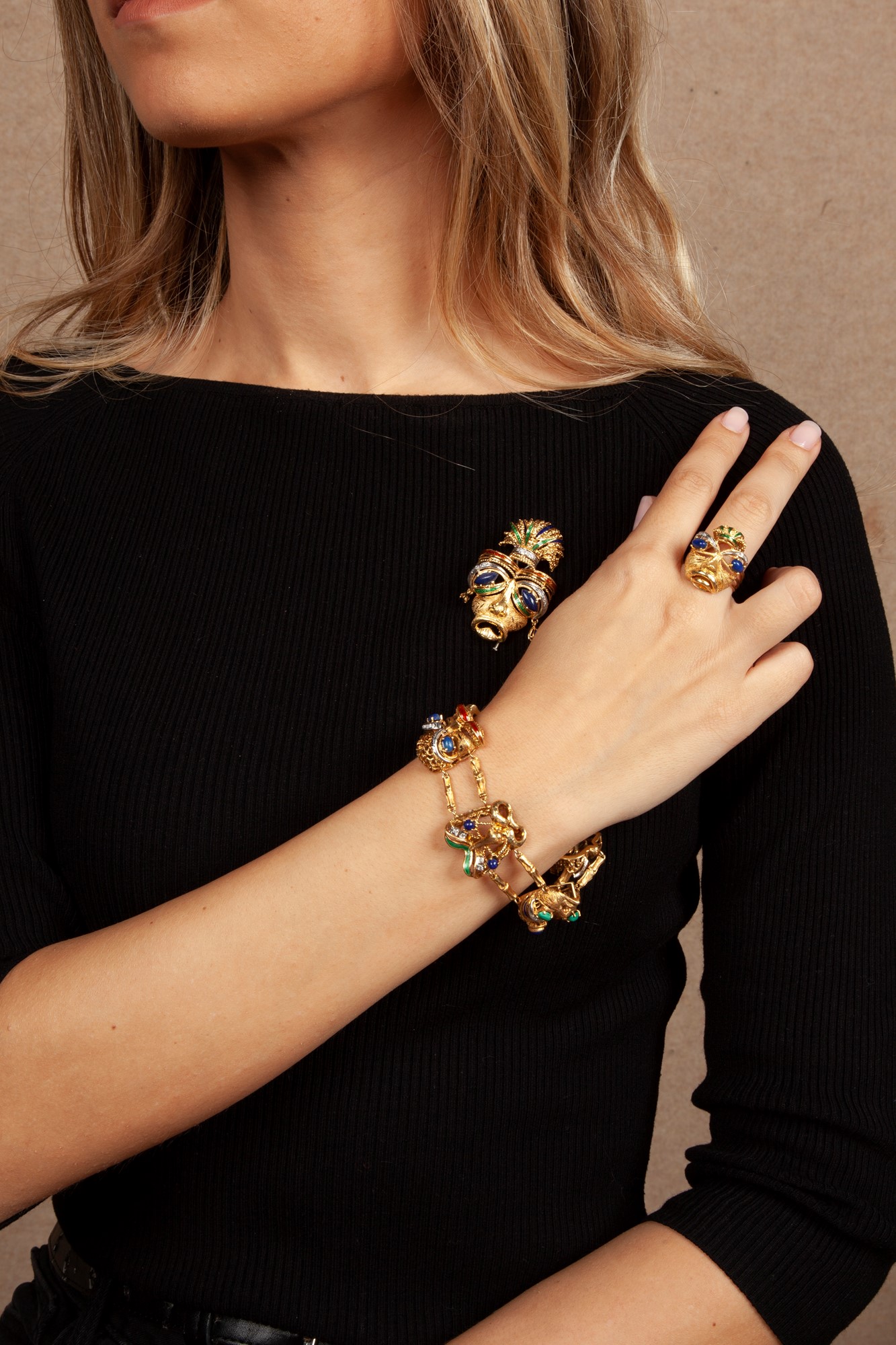 Parure spilla e anello in oro smalti e pietre Anello misura 20, spilla cm 6,5x3 Oro giallo 750/000. Diamanti ,smalti e lapislazzuli . Peso complessivo gr. 37,40