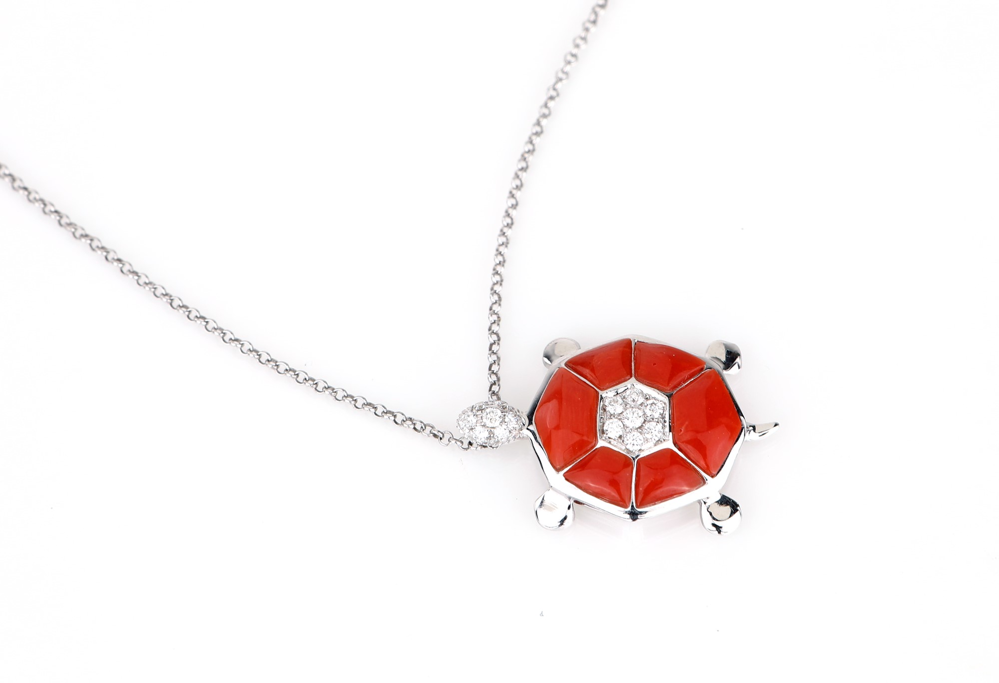 Pendente a tartaruga in oro smalti e brillanti Lunghezza catena cm 40. Pendente cm 2,5 x 1,5 Oro bianco 750/000. Peso complessivo gr. 5,30.