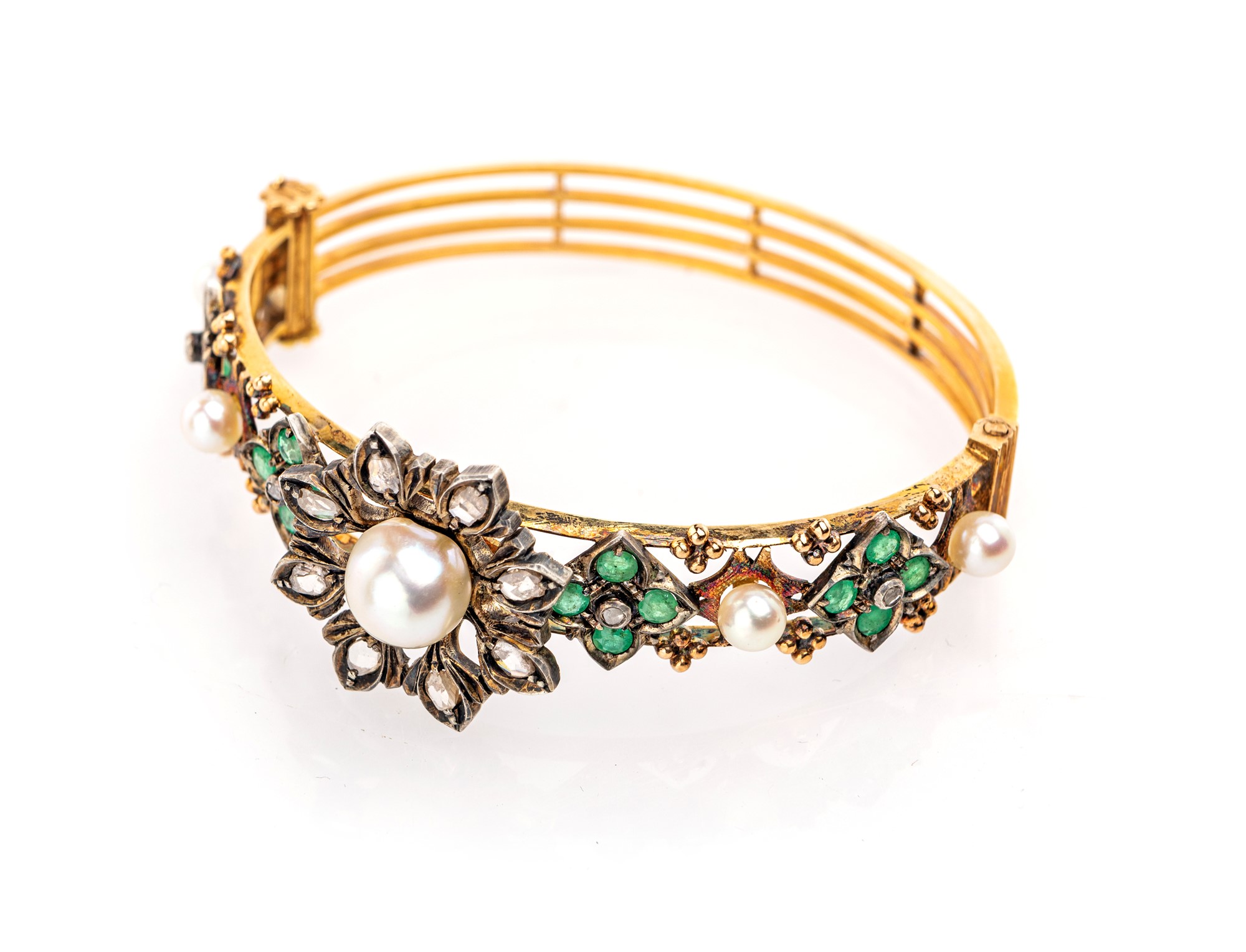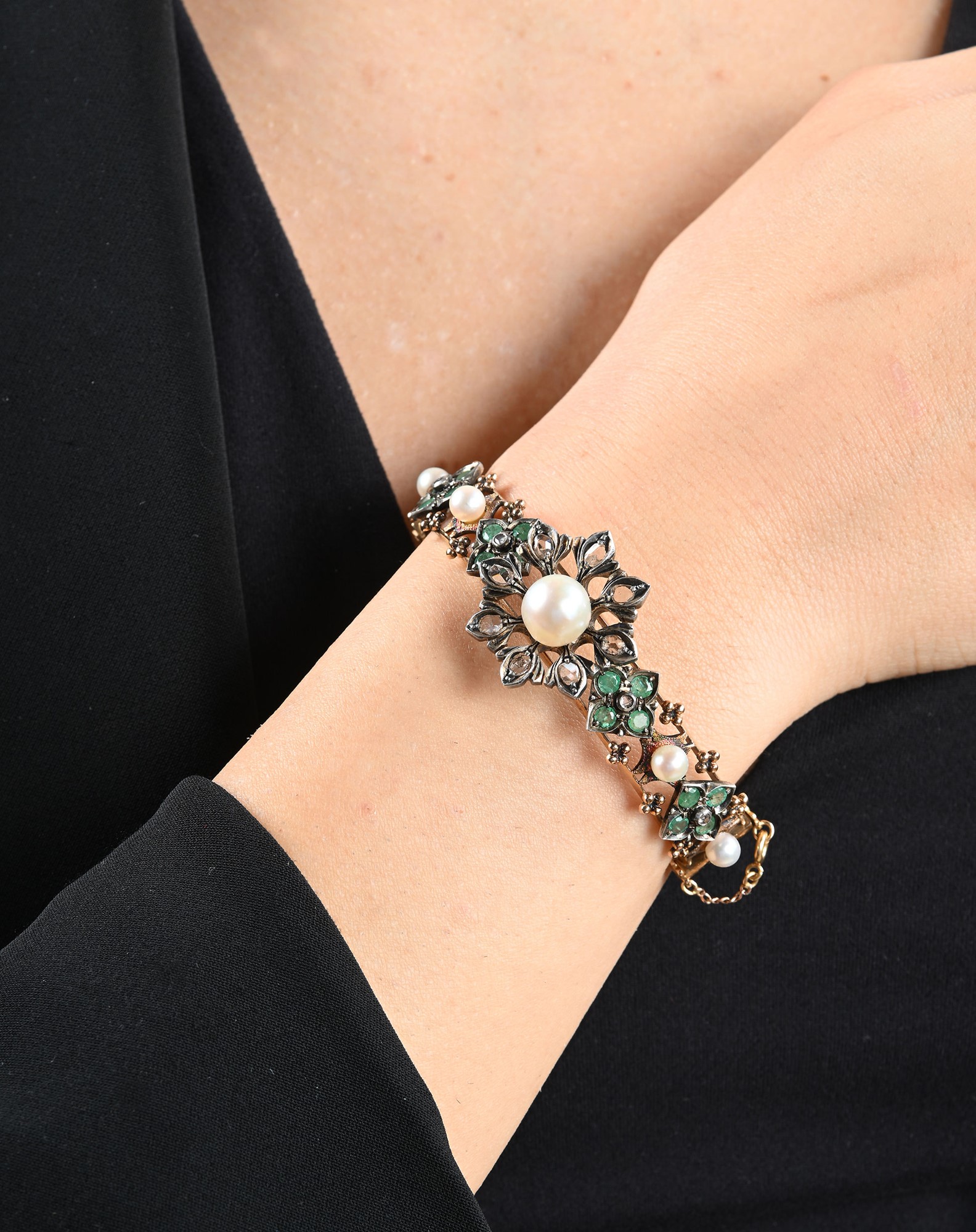 Lotto 235 | Bracciale in oro e argento, perle, diamanti e smeraldi