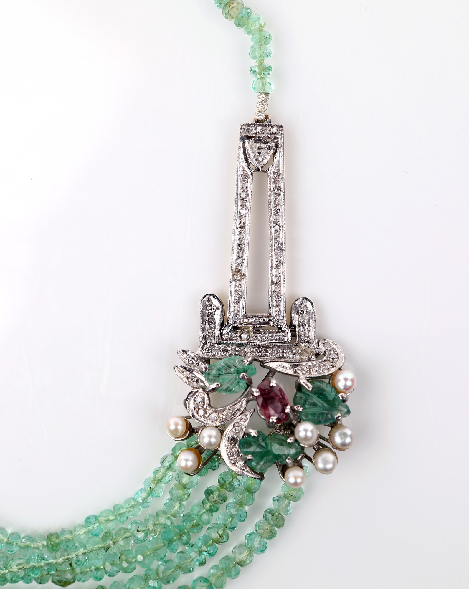 Collana in oro, argento, 5 fili di smeraldi, diamanti e tormaline