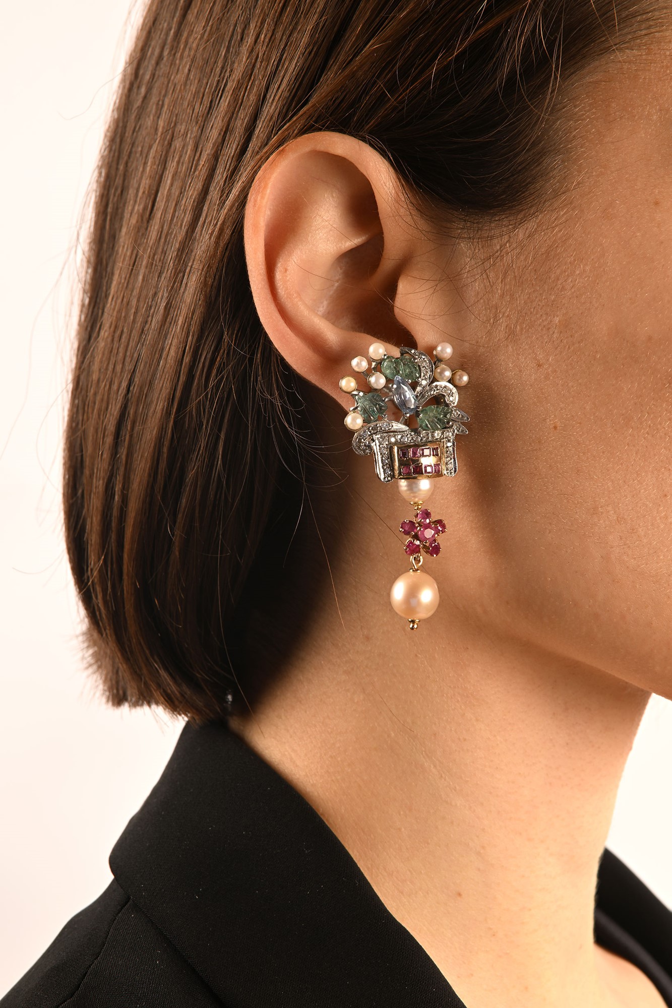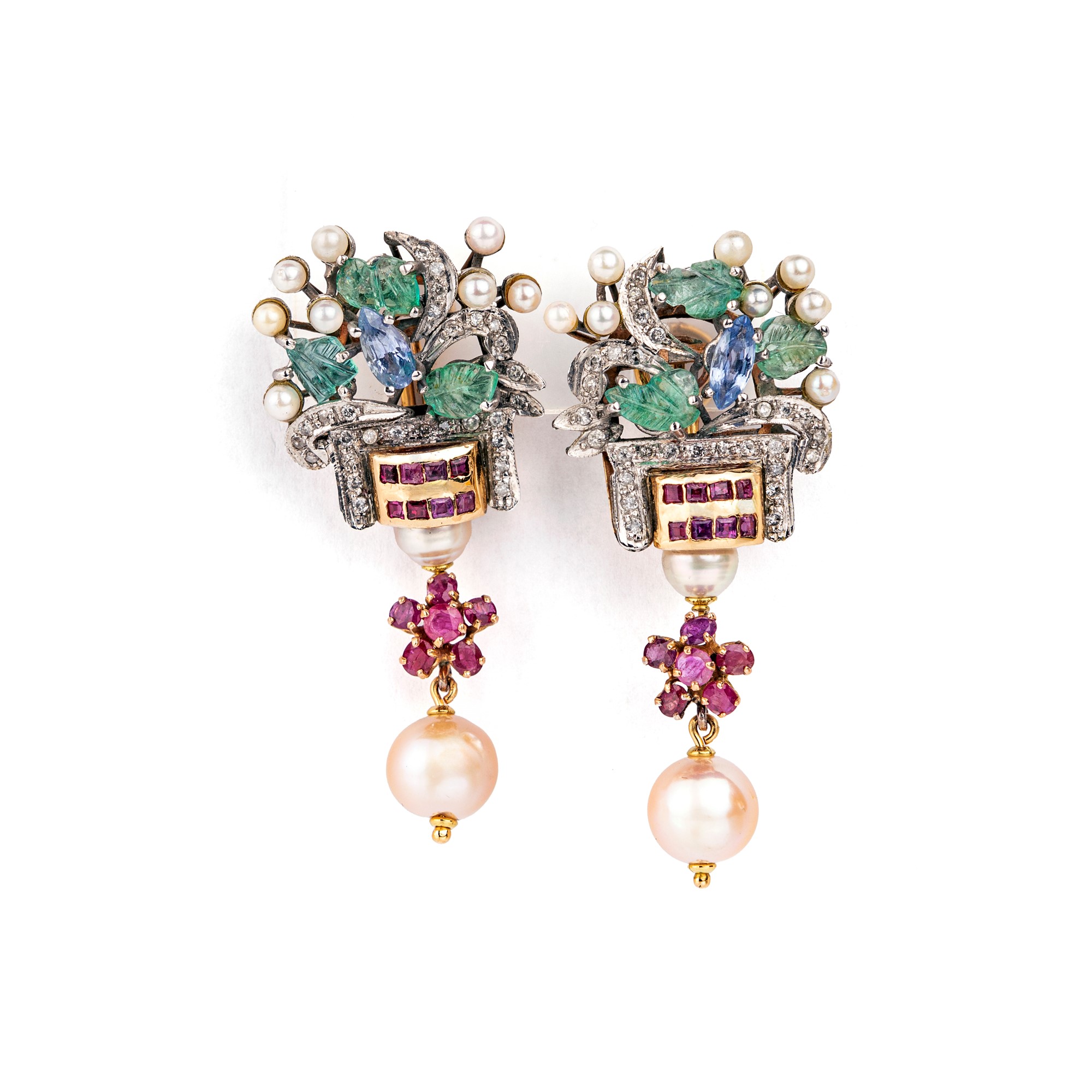 Orecchini pendenti tipo tuttifrutti in oro, argento, pietre preziose e perle Lunghezza cm 6 Oro a basso titolo, argento, smeraldi incisi, zaffiri, rubini e diamanti. Peso complessivo gr. 22,80