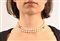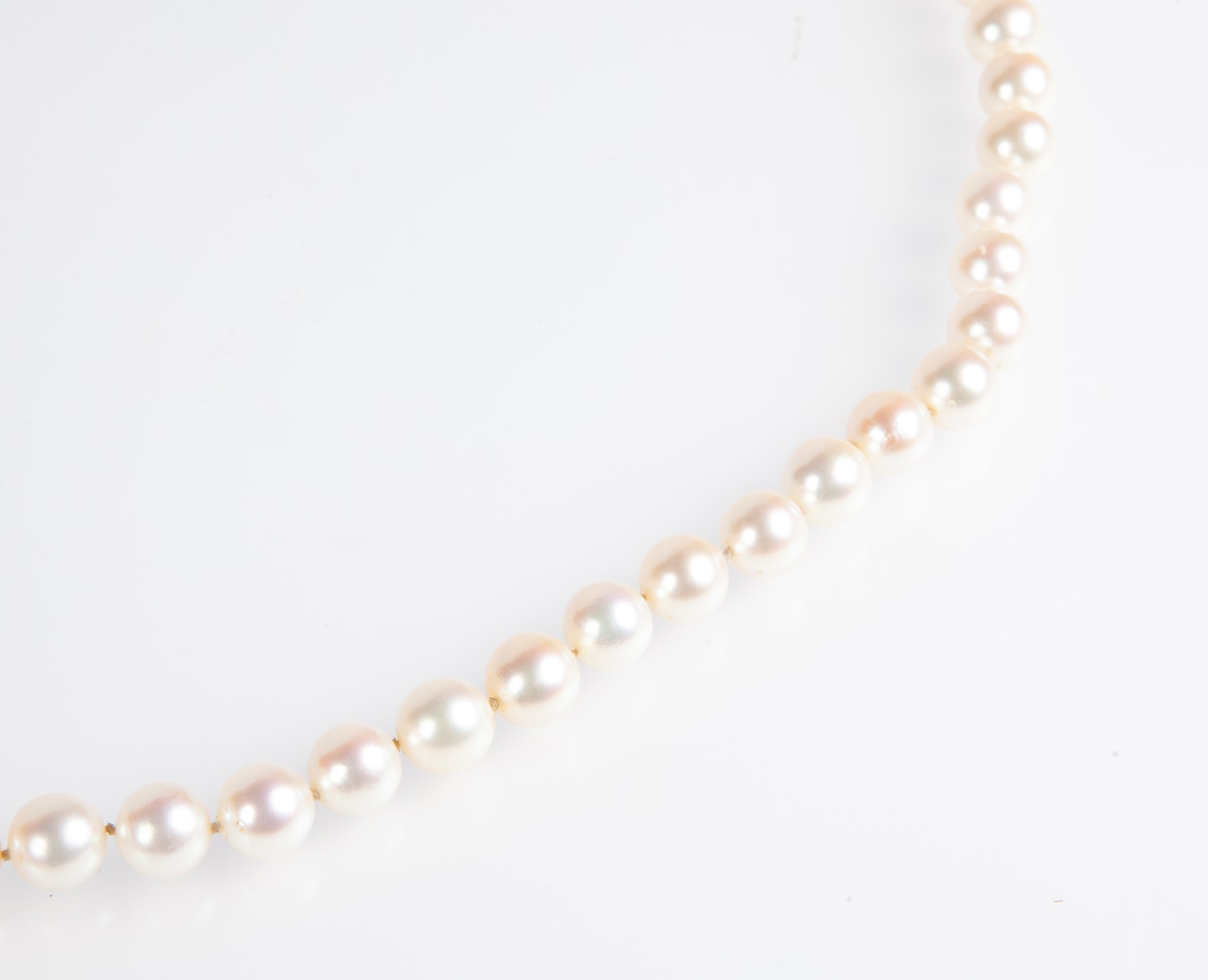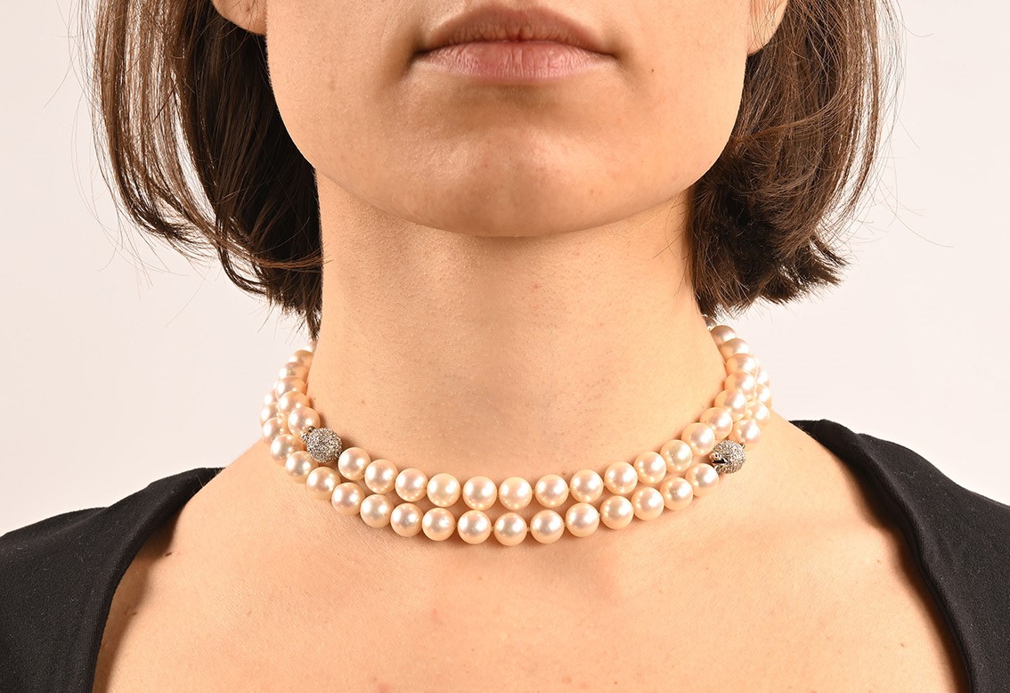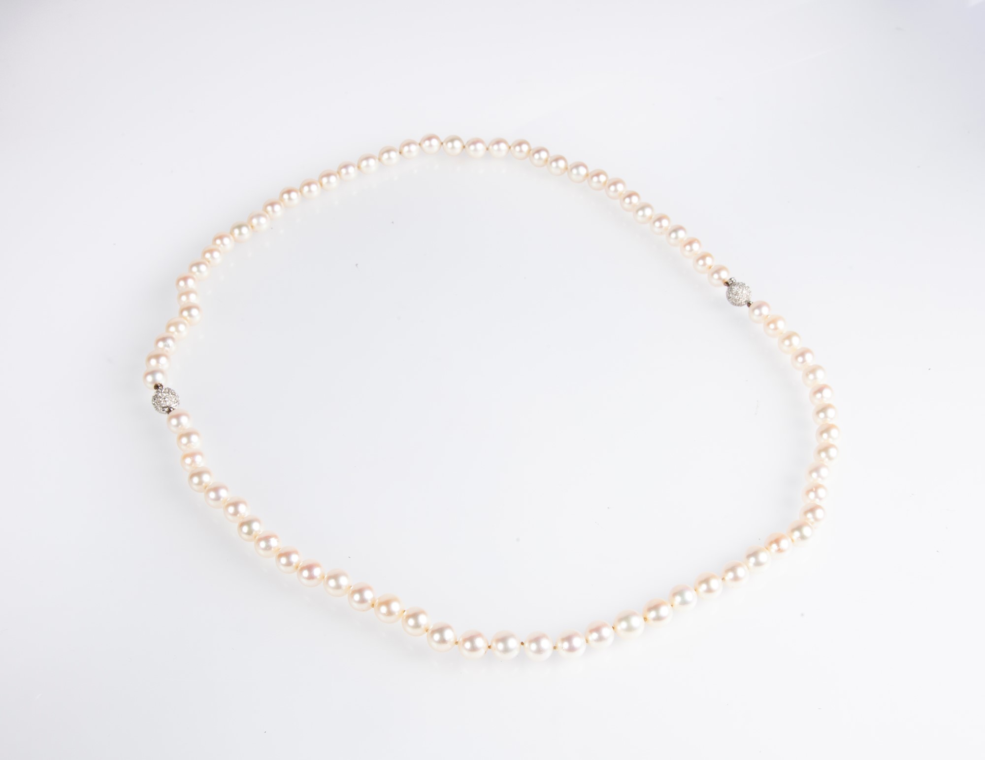 Collana di perle in oro e brillanti cm 76 Oro bianco 750/000, diamanti taglio rotondo brillante ct. 0,50 ca. Perle da coltivazione in acqua marina, Giappone, doppia chiusura. Peso complessivo gr. 92.