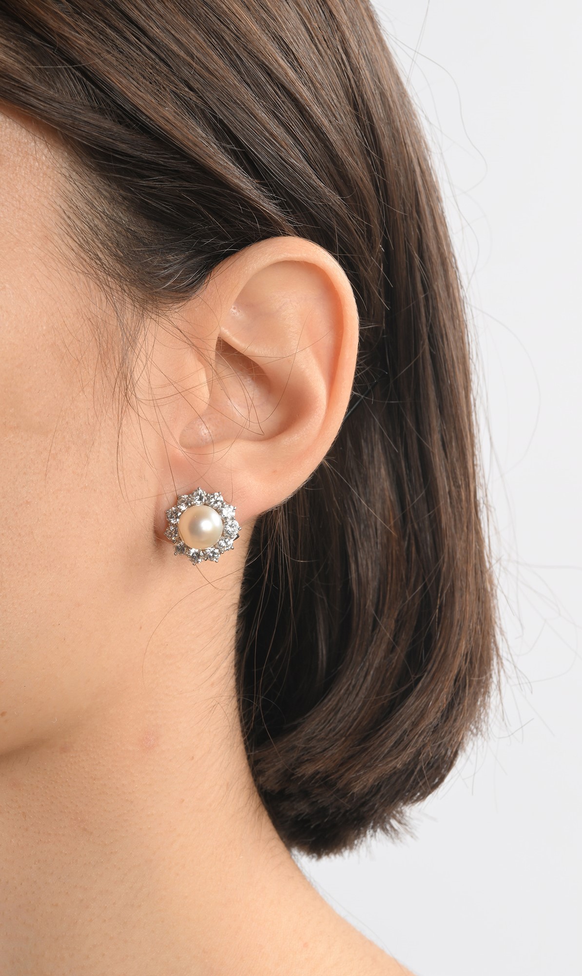 Orecchini in oro perla e brillanti Diametro mm. 14 Oro bianco 750/000. Perla da coltivazione in acqua marina mm. 9, diamanti in taglio rotondo brillante ct. 1,50 ca.
