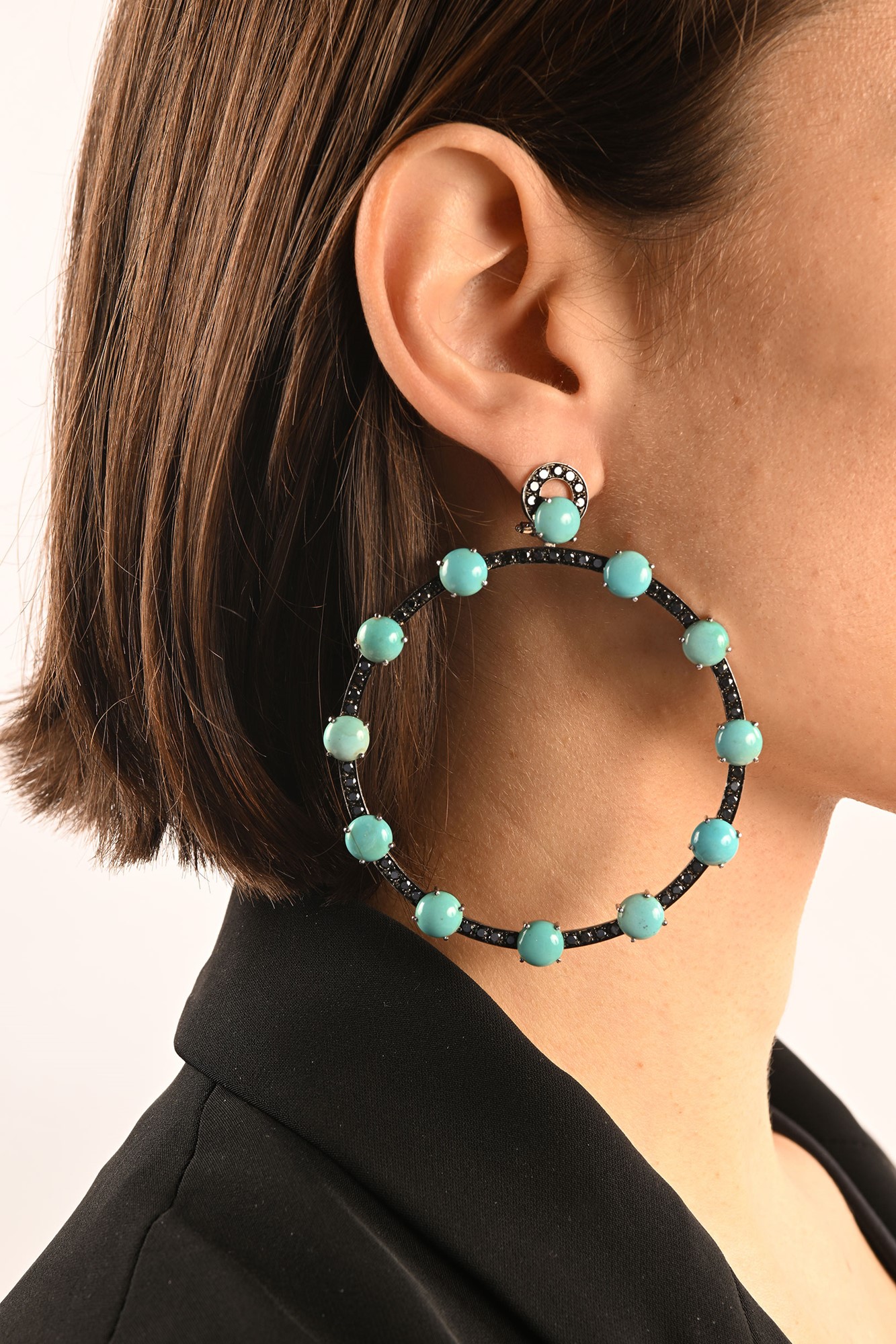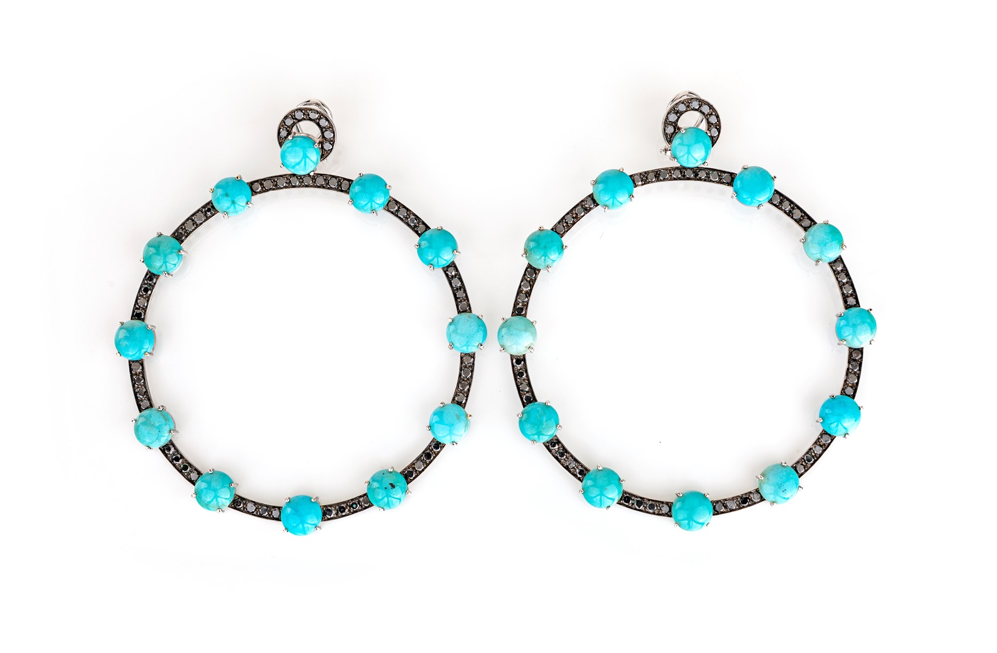 Orecchini pendenti in oro brillanti e turchesi Lunghezza cm 8 Oro bianco 750/000. Diamanti fancy black e turchese. Peso complessivo gr. 34.