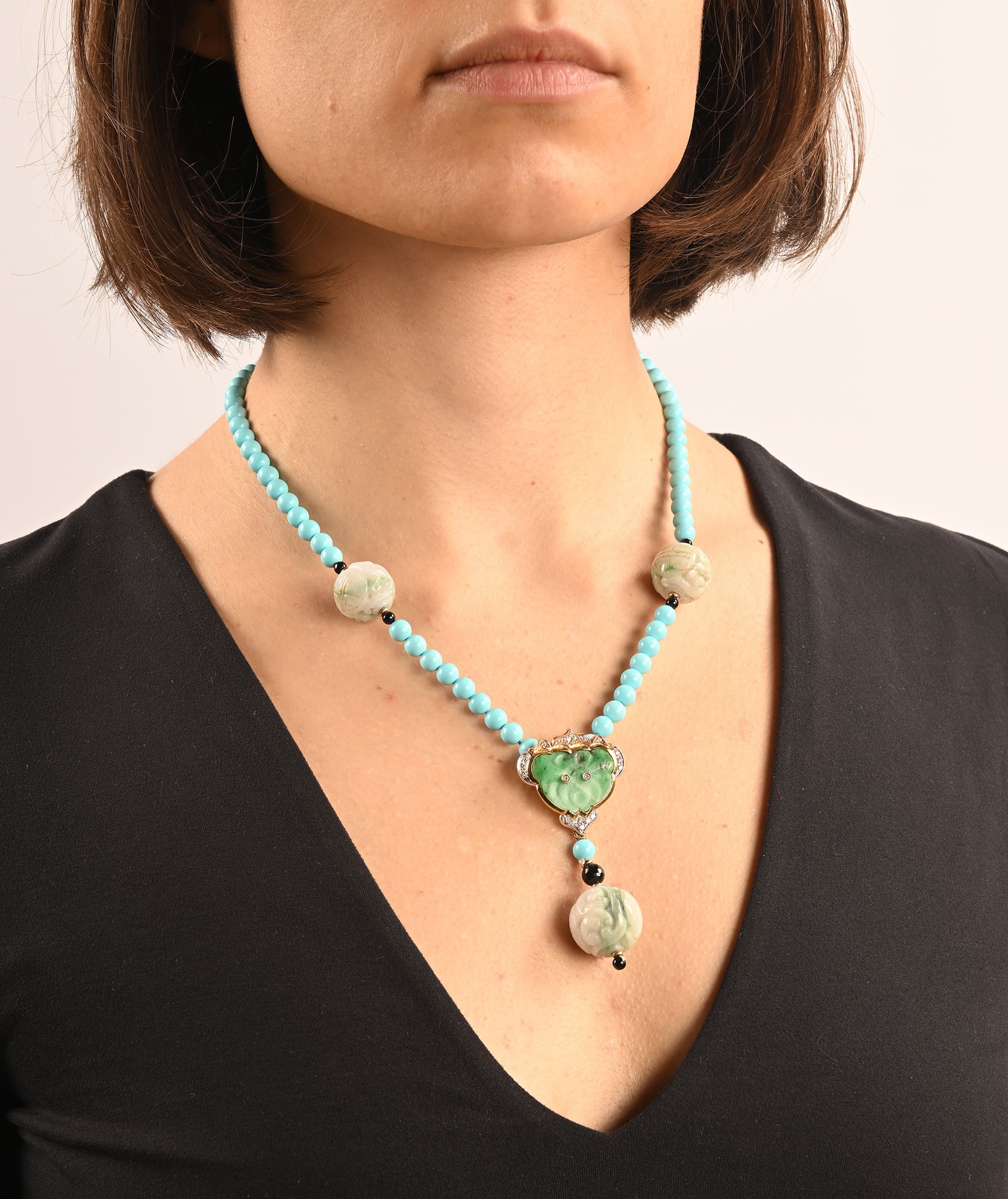 Collana in oro, turchese, giada, calcedonio e brillanti Lunghezza cm 60 Oro giallo 750/000, brillanti, turchese, giada e calcedonio incisi. Spilla centrale estraibile. Peso complessivo gr 62.