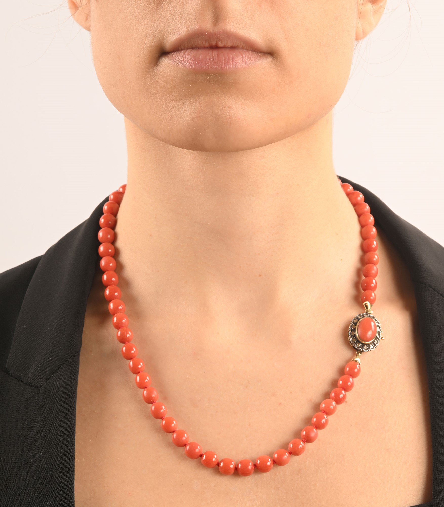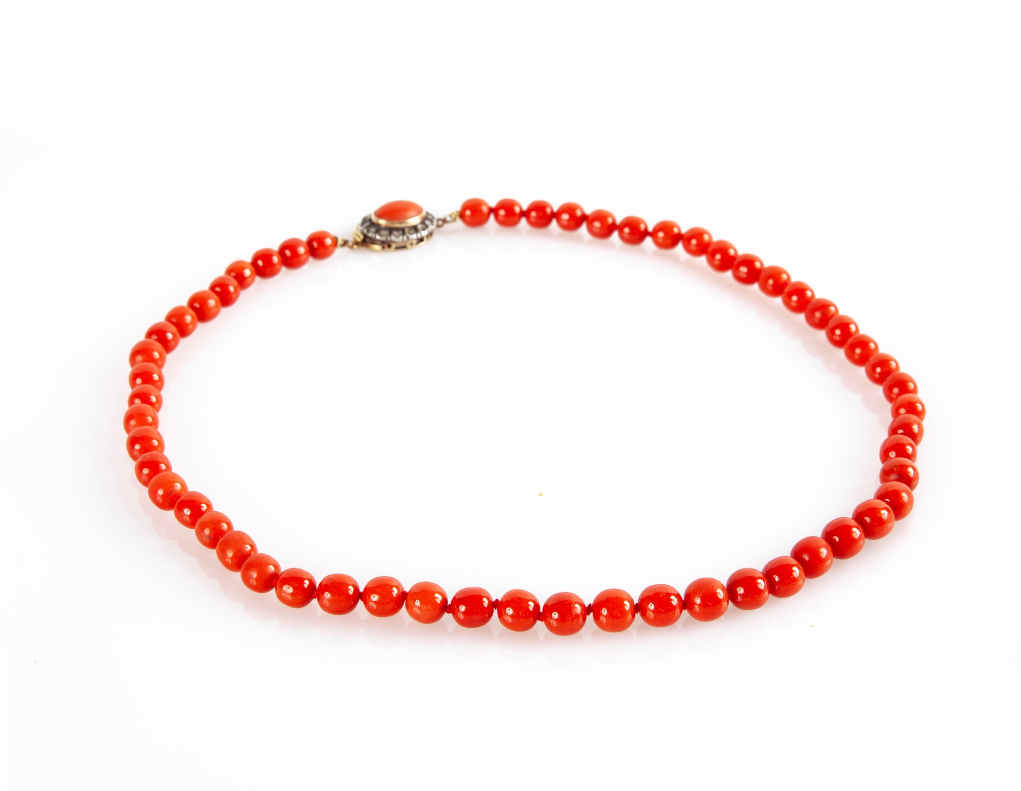 Collana in oro, corallo e diamanti diametro 8 mm; lunghezza 53 cm Oro giallo 750/000, argento, diamanti e corallo rosso. Peso complessivo gr 53,60
