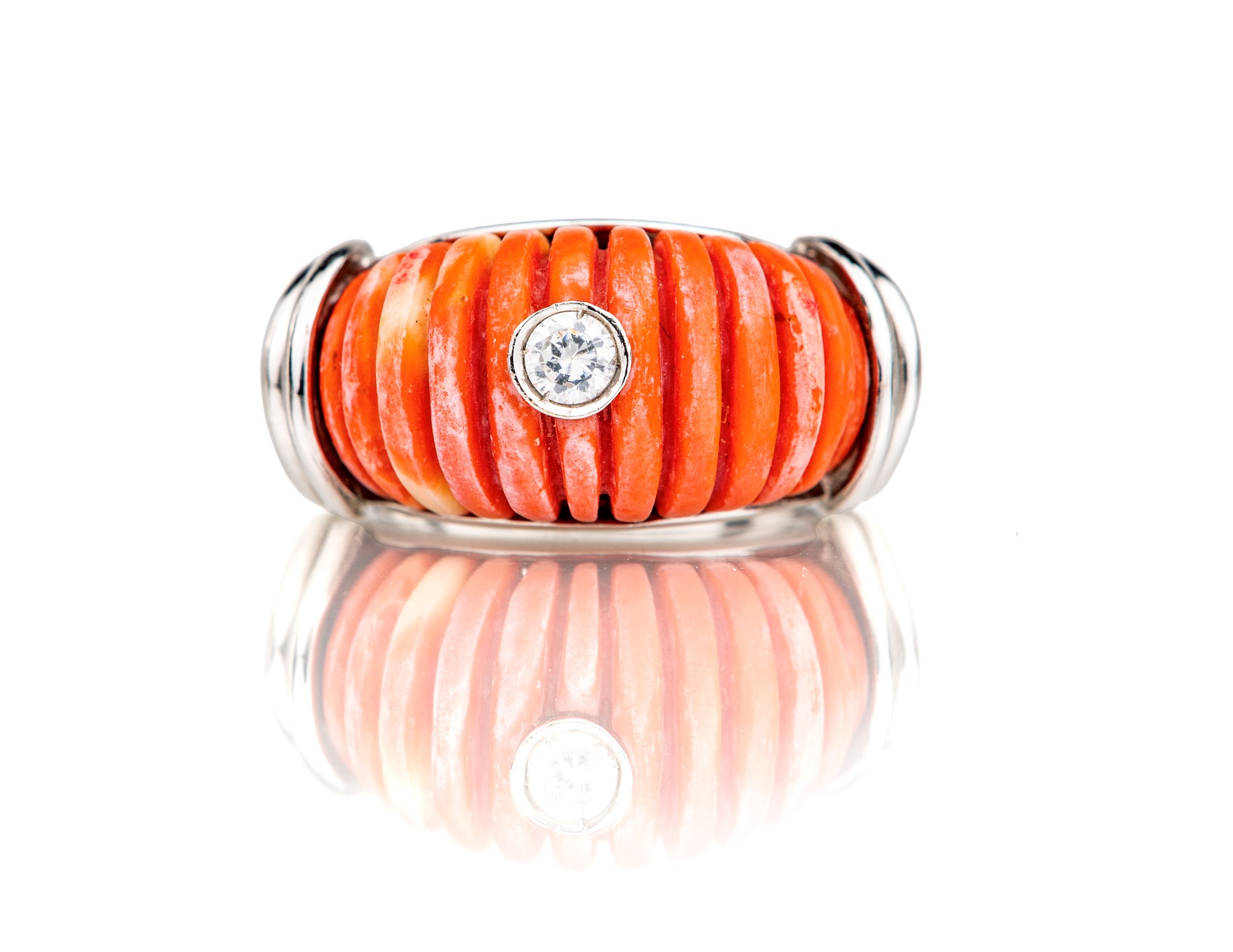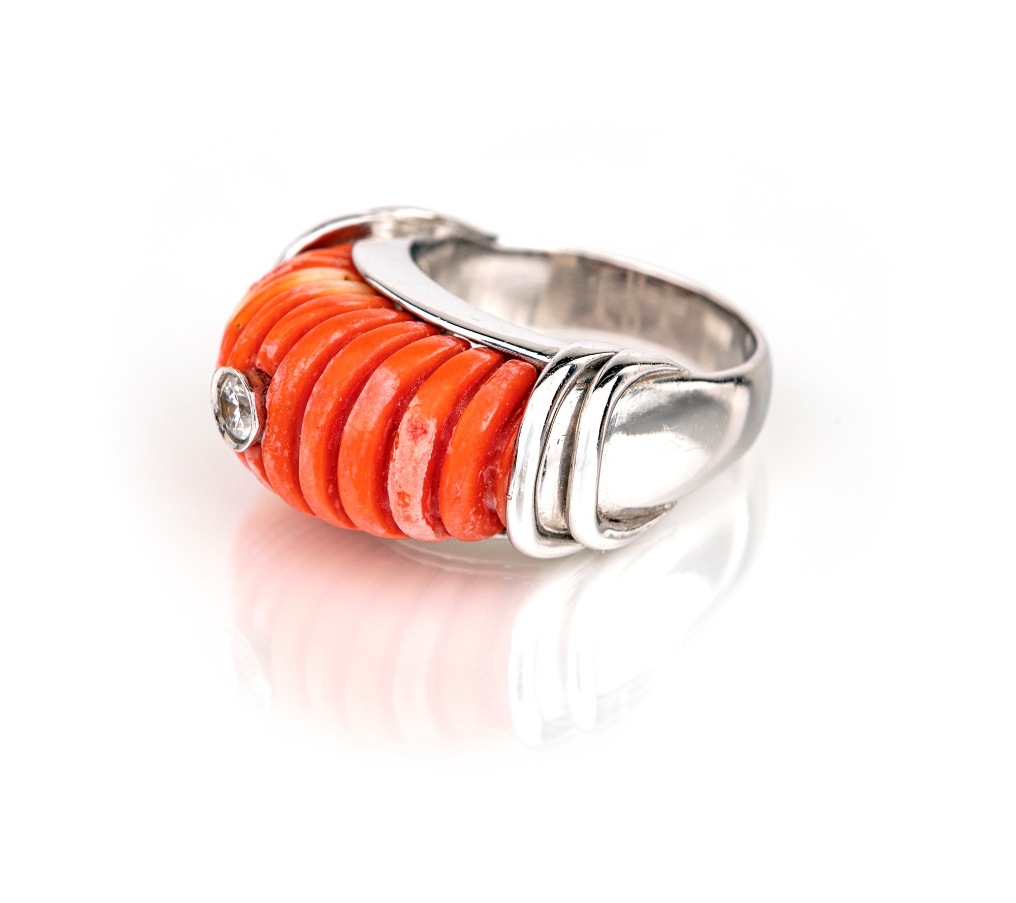 Anello in oro, corallo baccellato e brillanti Misura 19 Oro bianco 750/000. Peso complessivo gr 16,30