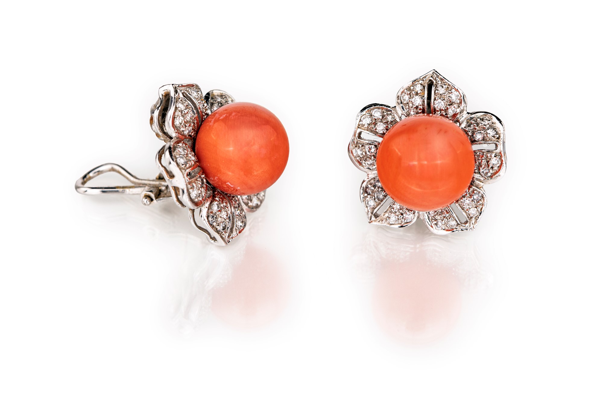 Orecchini a fiore in oro, corallo e diamanti Peso complessivo gr 18,20. Corallo sferico diametro mm 12. Diamanti in taglio rotondo brillante ct. 0.70 ca.