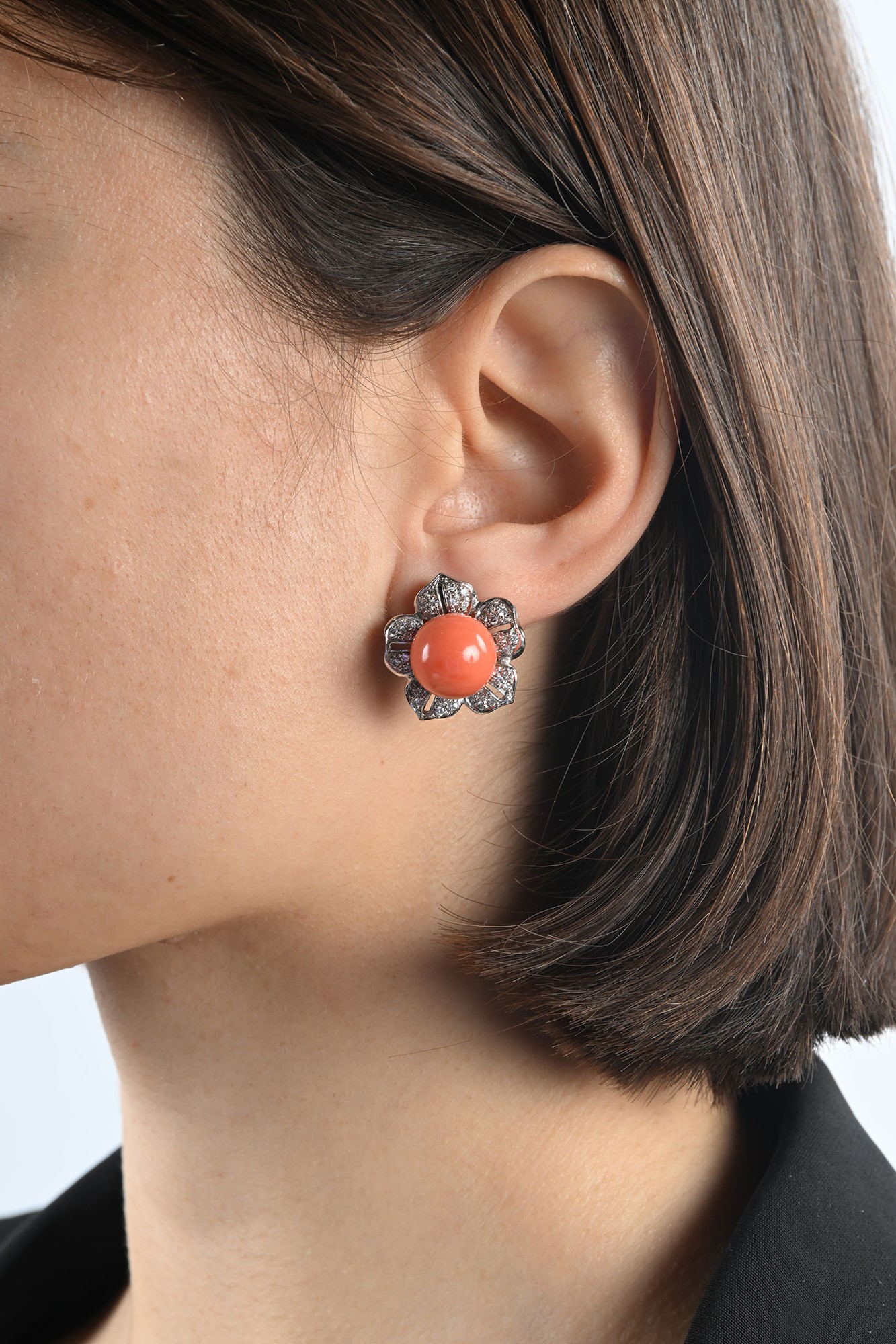 Orecchini a fiore in oro, corallo e diamanti