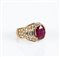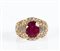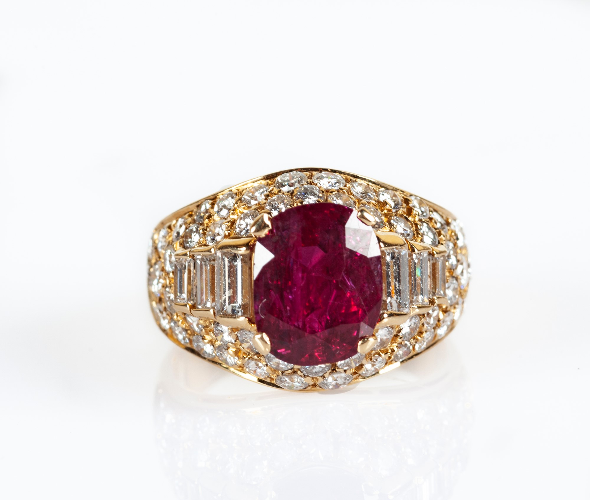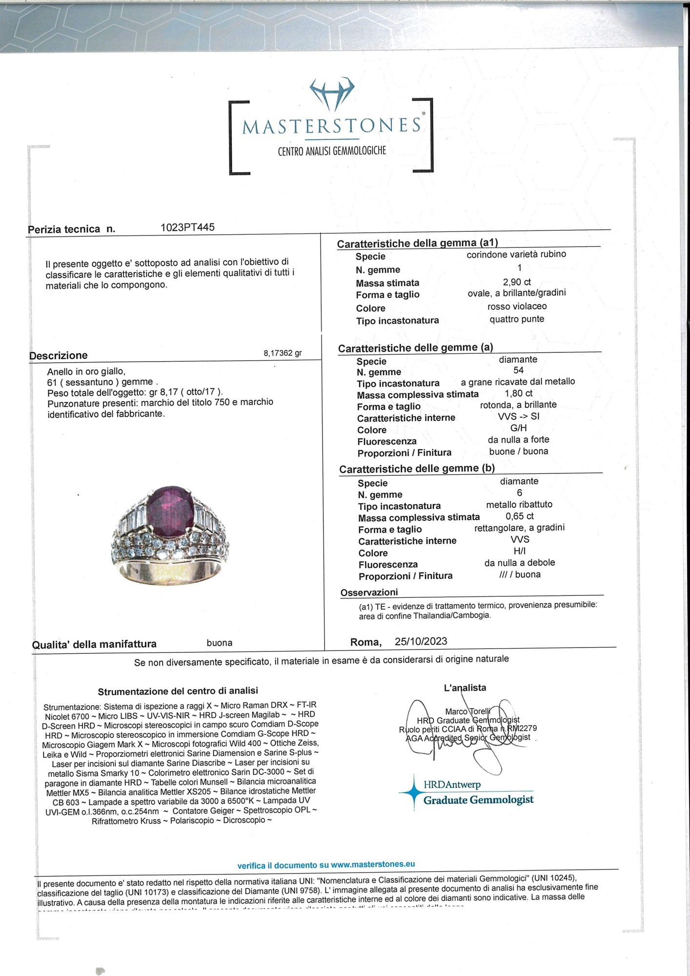 Anello in oro, brillanti e rubino Misura 14 Oro giallo 750/000. Rubino naturale in taglio ovale ct. 2,90, diamanti naturali in taglio rotondo e a gradini, ct. 2,45, G-H-I, VVS-SI. Peso complessivo gr. 8,10