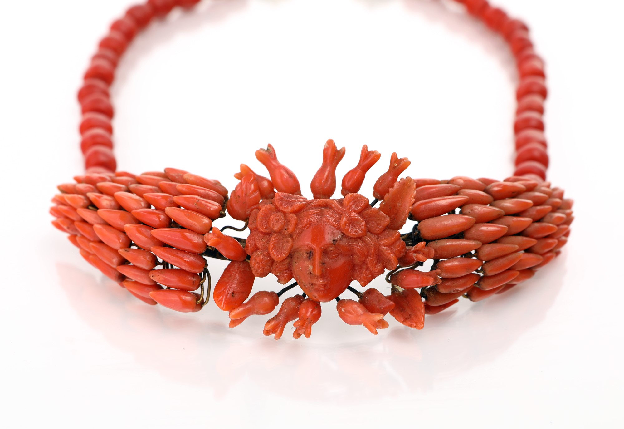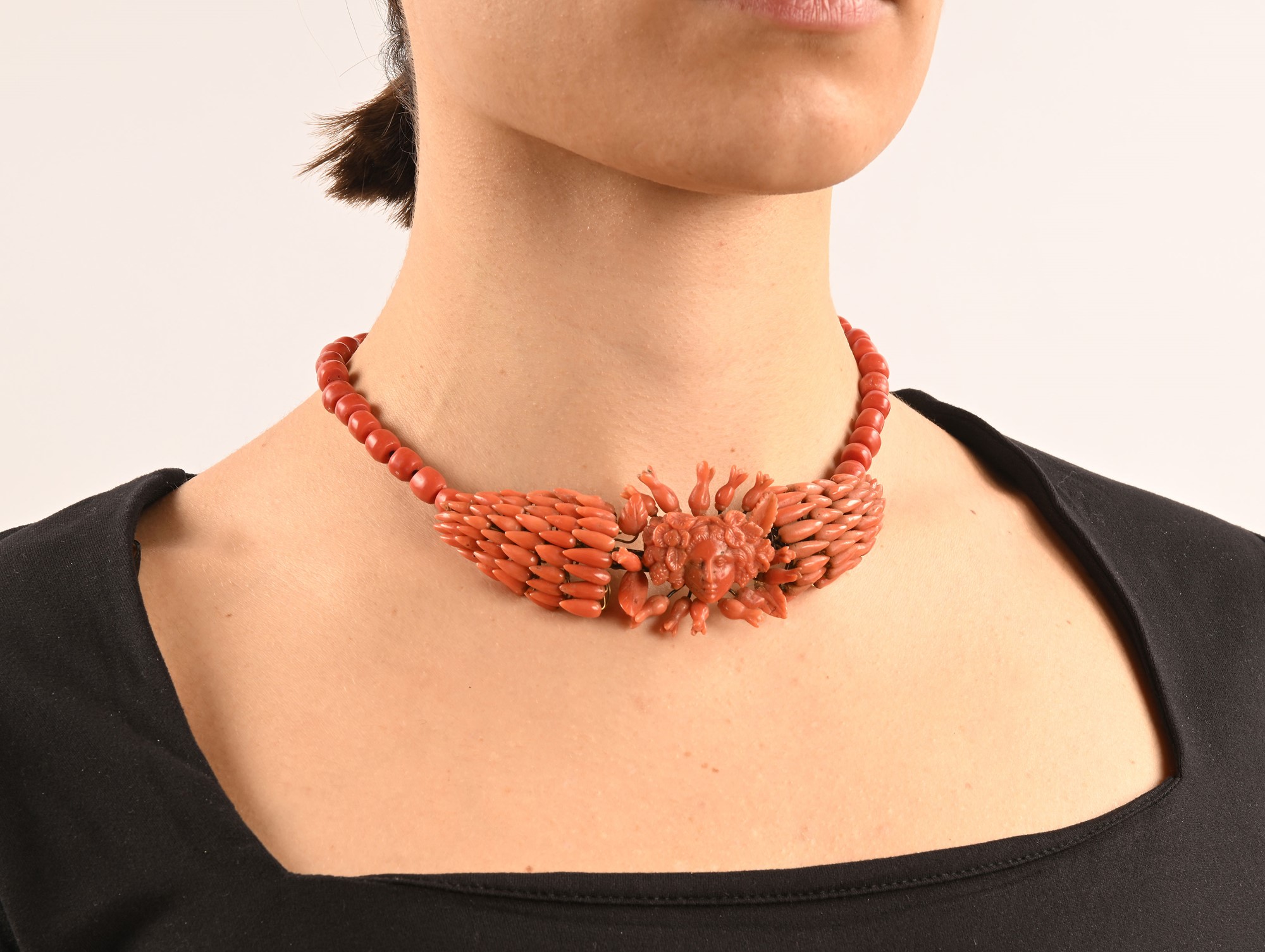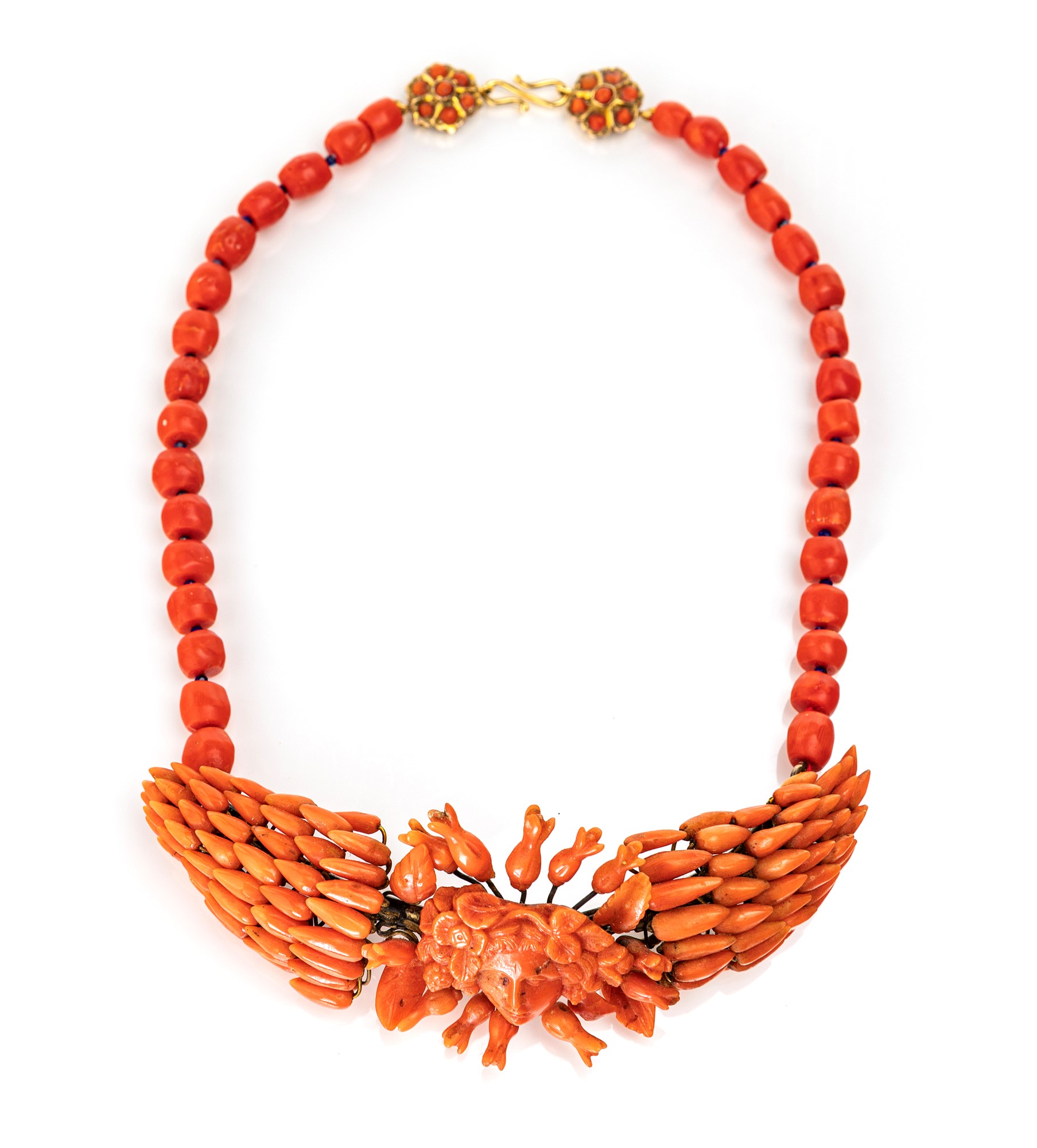 Collana antica in corallo Lunghezza cm 40 Oro, metallo e corallo in taglio barilotto e scolpito