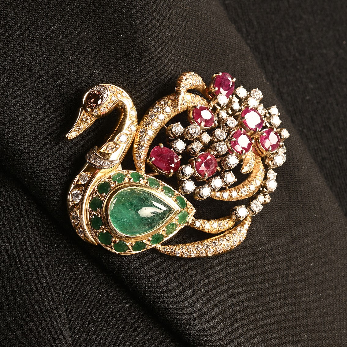 Spilla a cigno in oro, brillanti, rubini e smeraldi. cm 6,5 x 5 Oro giallo 750/000. Diamanti in taglio rotondo brillante ct. 3,50 ca, prob G-H VS. Diamanti fancy ct. 0,40 ca. Rubini in taglio ovale ct. 18 ca. Smeraldi in taglio tondo e cabochon ct. 8 ca. Peso complessivo gr. 42,10.