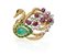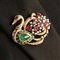 Spilla a cigno in oro, brillanti, rubini e smeraldi.