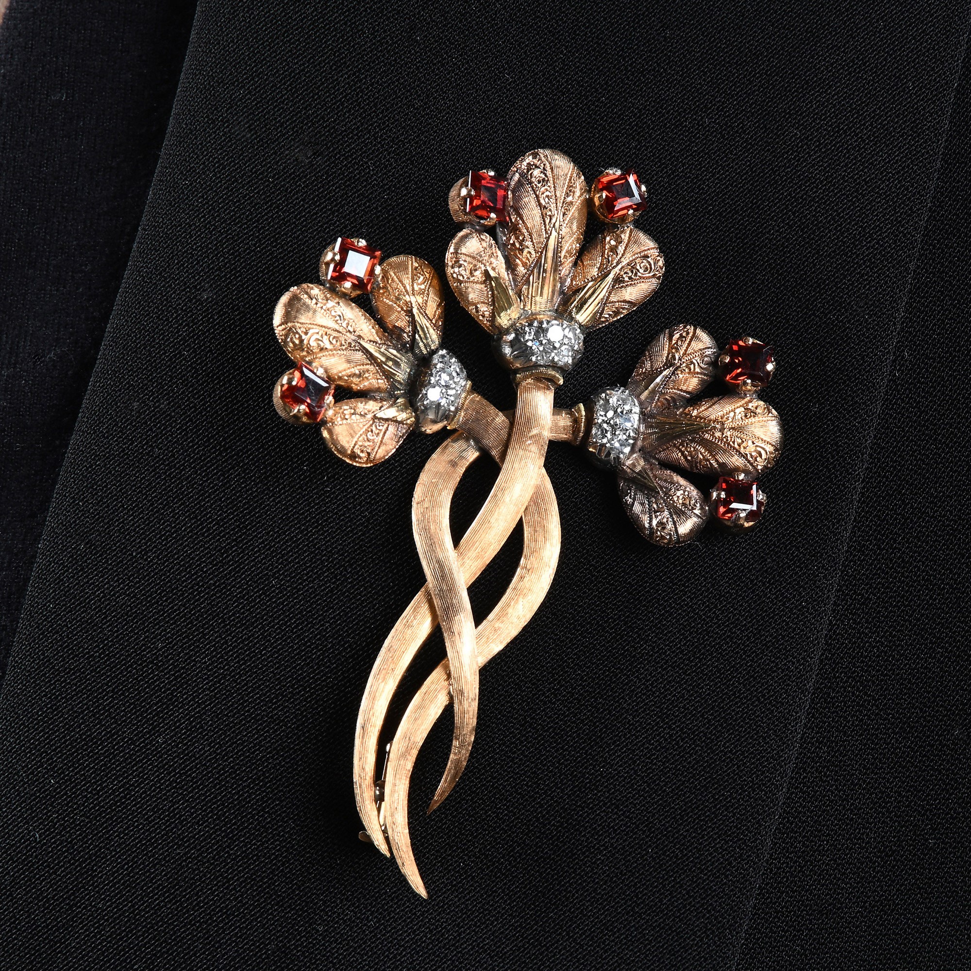 Cazzaniga, spilla in oro diamanti e granati cm 6 x 4