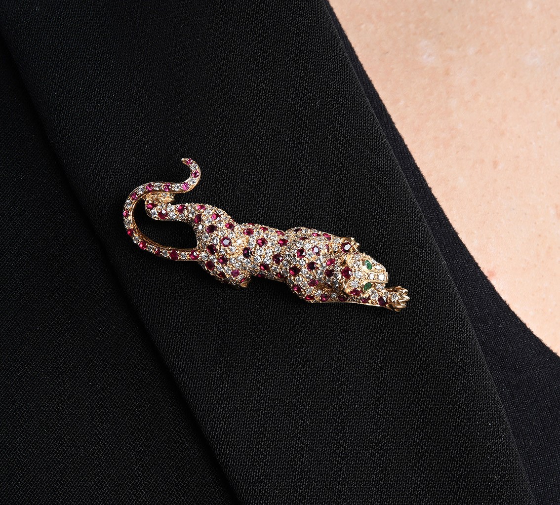 Spilla pantera in oro brillanti e rubini Lunghezza cm 4,5 Oro giallo 750/000. Diamanti in taglio rotondo brillante e rubini. Peso complessivo gr. 7,70.