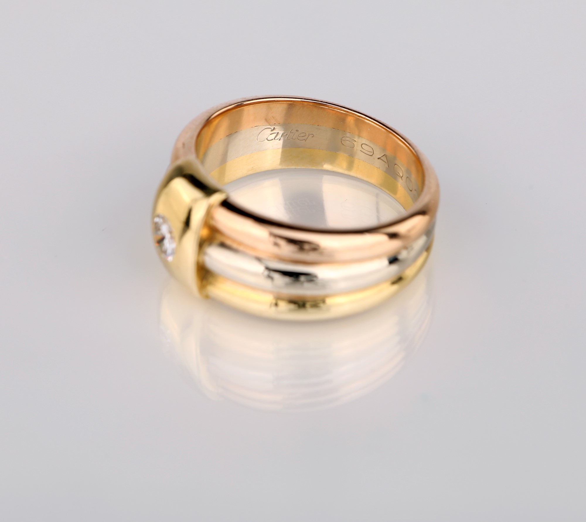 Cartier anello in oro e brillante Misura 11 Oro giallo, bianco e rosa 750/000. Diamante in taglio rotondo brillante ct. 0,12 ca. Peso complessivo gr. 9,20.