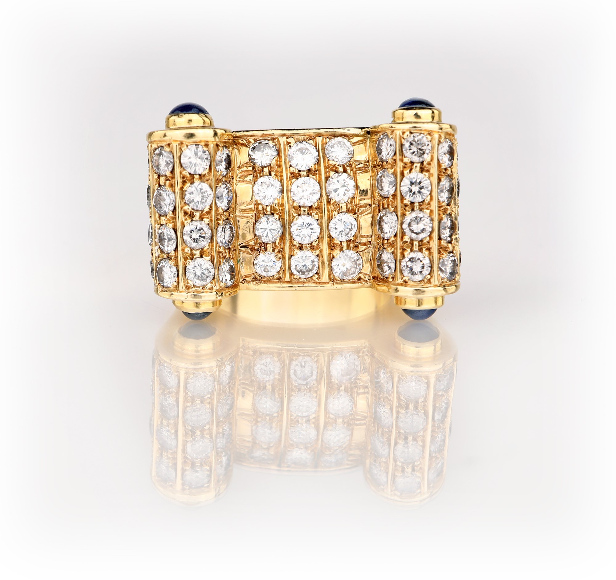 Anello a ponte in oro, brillanti e zaffiri Misura 18 Oro giallo 750/000. Zaffiri in taglio cabochon. Diamanti taglio rotondo brillante, ct. 1,60 ca. H-I, VS-SI. Peso complessivo gr 22,30