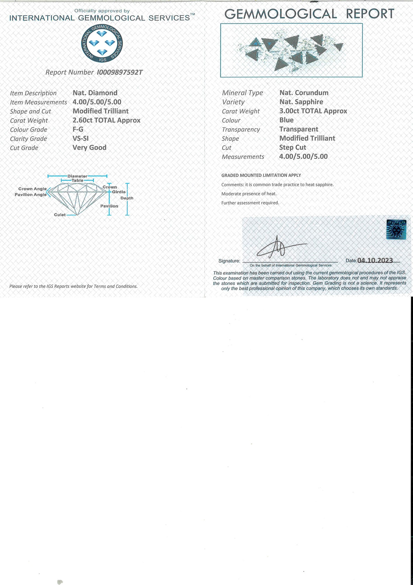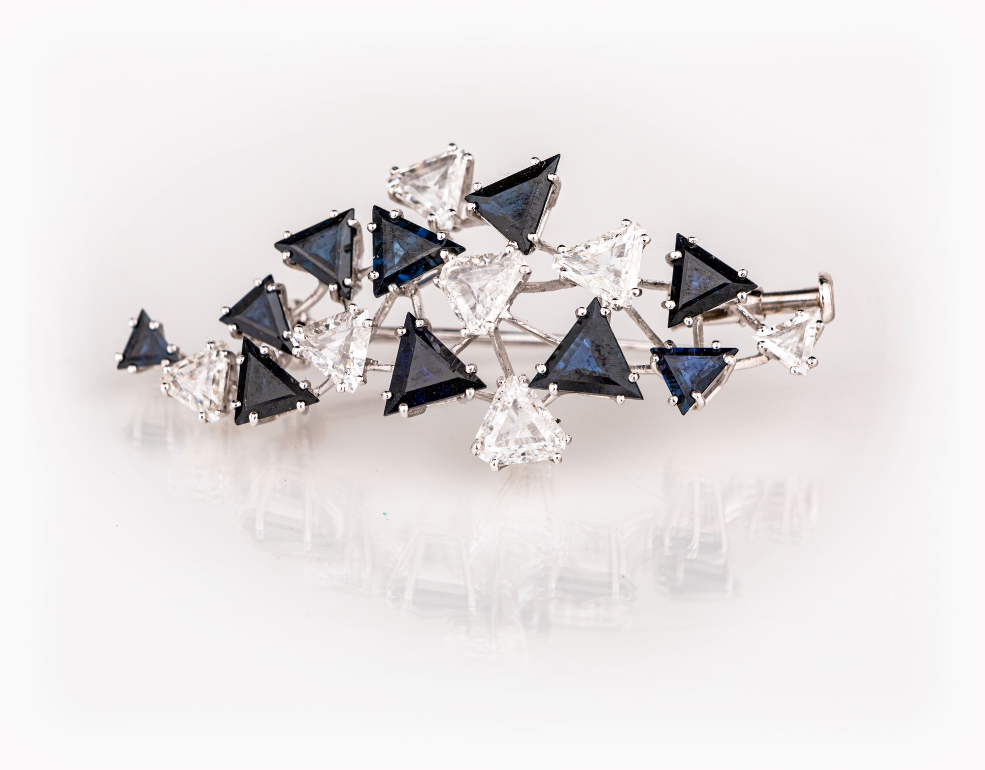 Spilla in oro diamanti e zaffiri Cm 5x 2,50 Oro bianco 750/000. Diamanti in taglio triangolo ct. 2,60 F-G, VS-SI. Zaffiri in taglio triangolo ct. 3,00. Peso complessivo gr. 7,40. Corredato di certificazione gemmologica.