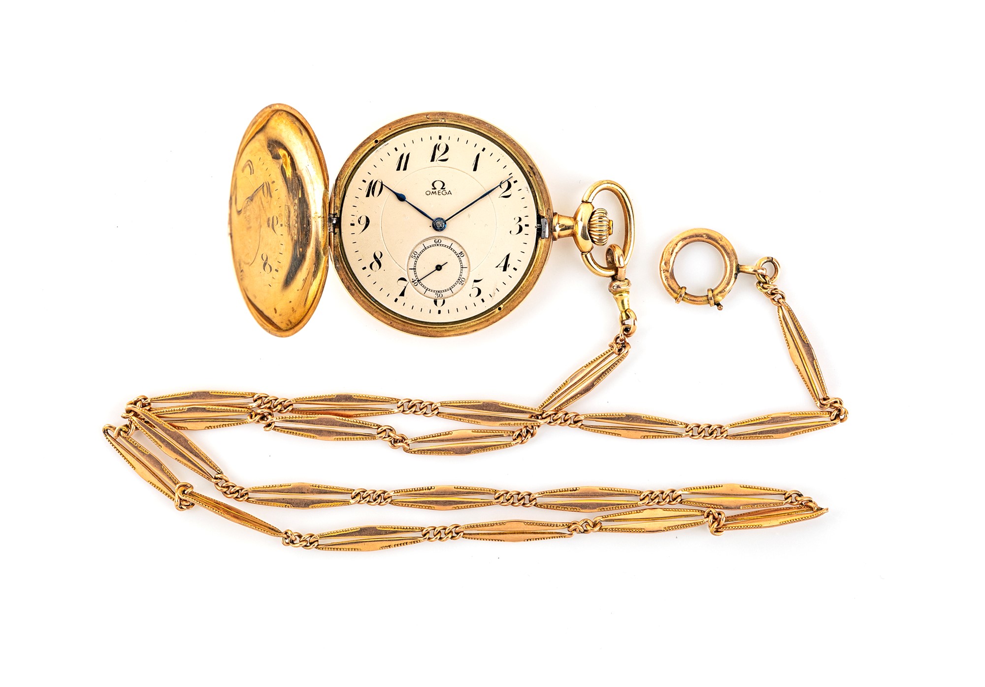 Omega, orologio da tasca in oro savonette con catena in oro Diametro mm 59 Oro 585/000. Remontoir a savonette, cassa a 4 corpi n° 3841908. Quadrante argentato, numeri arabi, secondi in basso, lancette a pera. Movimento scappamento ad ancora, bilanciere bimetalico con viti, spirale Breguet. Lunetta mancante. Da revisionare Primi '900