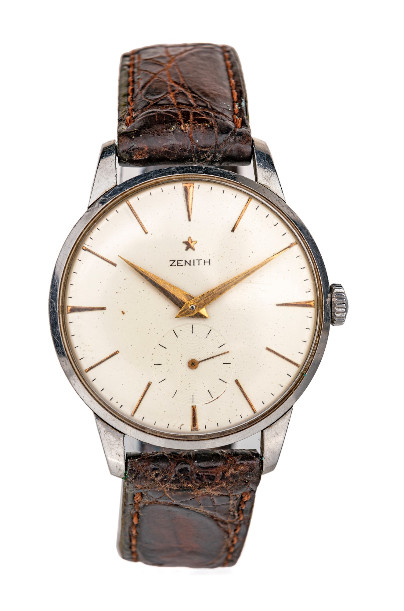 Zenith da polso in acciaio Diametro cassamm. 37 Acciao. Cassa n° 9502745, copripolvere in plexiglass, fondello a scatto. Quadrante argentato, indici a conio, secondi in basso, lancette dauphine. Movimento manuale, dorato n°4997455, bilanciere monometalico con viti, spirale piana. Anni '50.