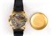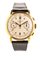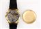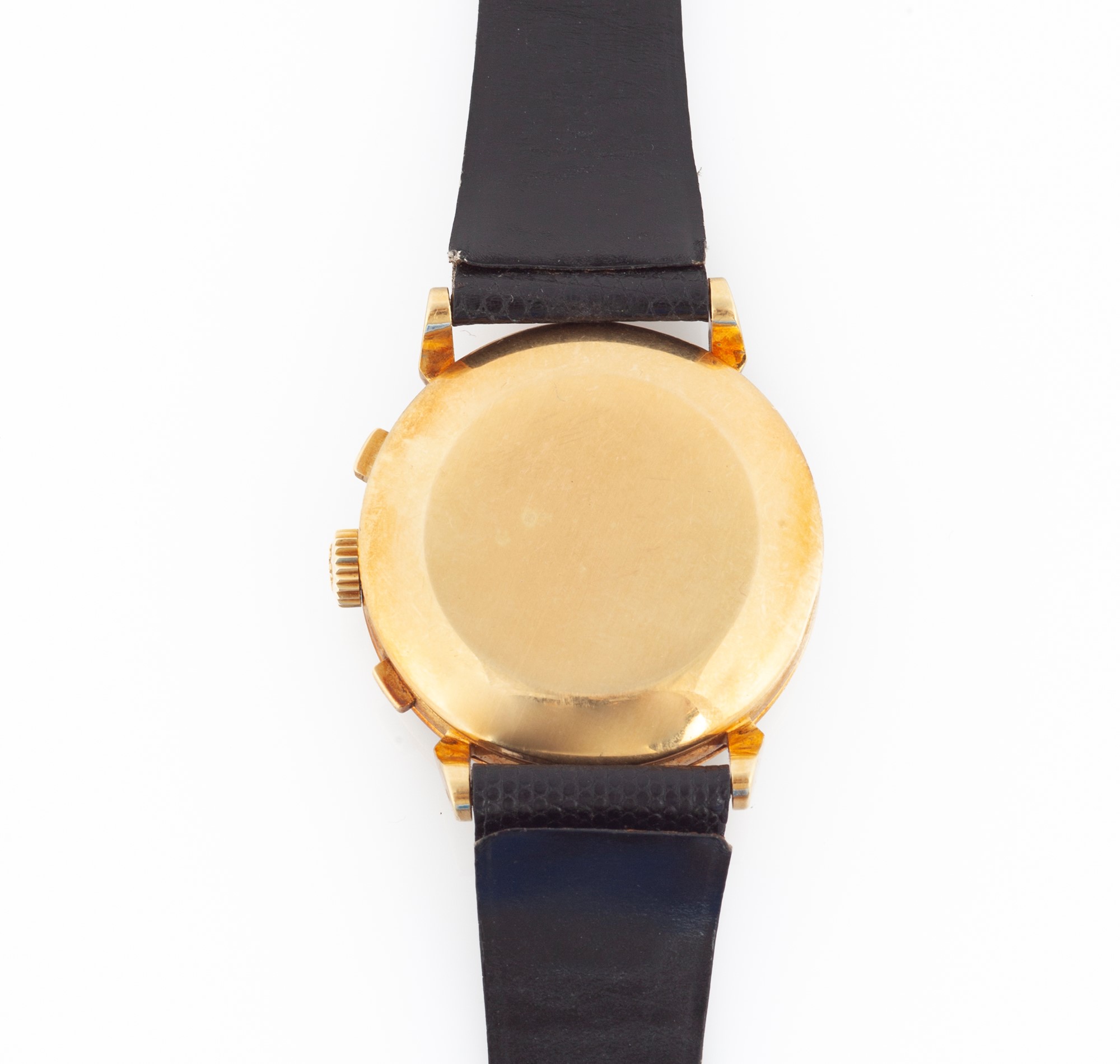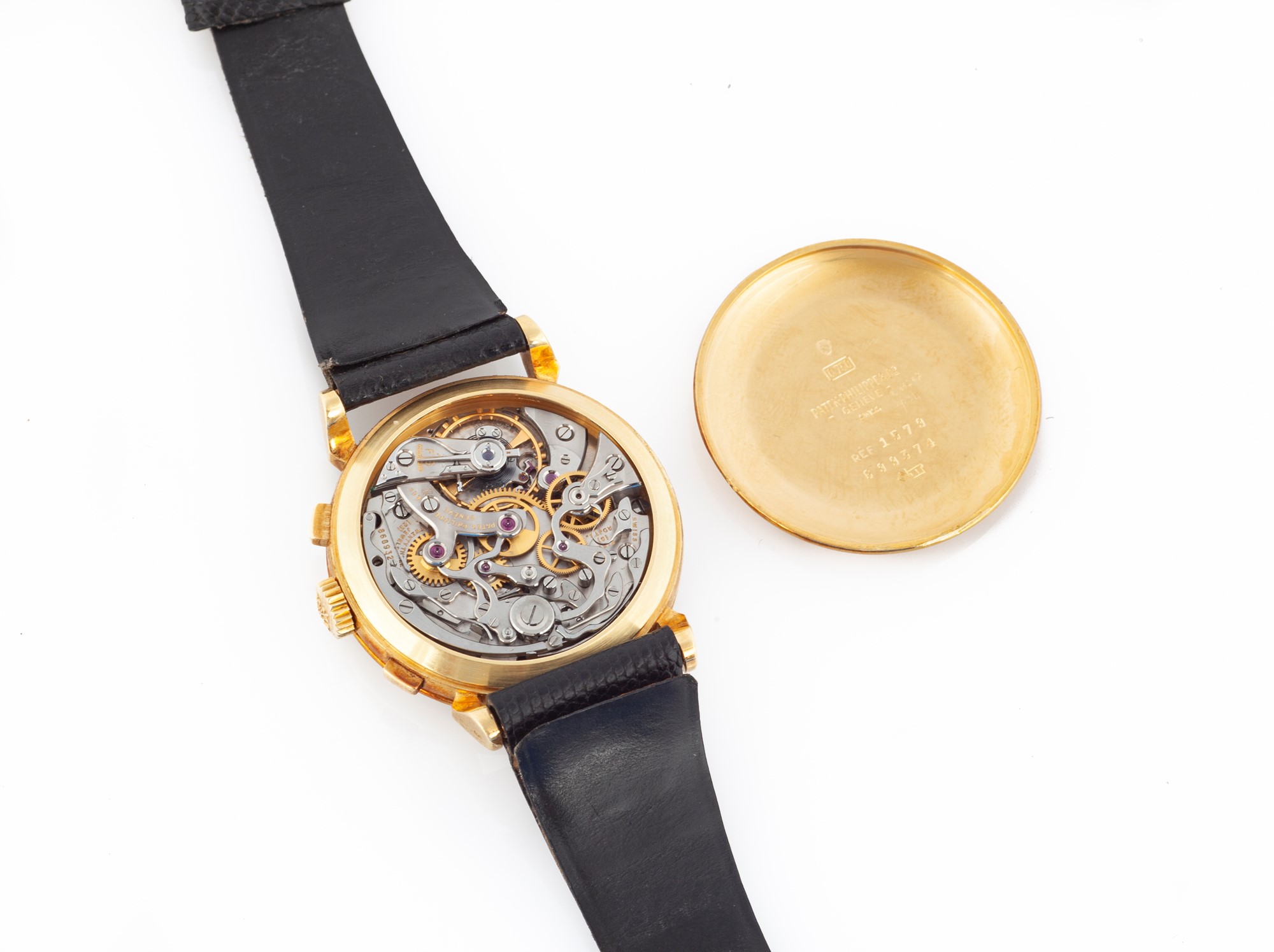 Patek Philippe Orologio Cronografo in oro Diametro cassa mm. 35 Oro giallo 750/000. Ref. 1579, cassa n° 699374, pulsanti rettangolari, fondello a scatto. Quadrante argentato, indici applicati, quadrantini ausiliari dei secondi e del sommatore minuti, scala tachimetrica, lancette a foglia, movimento manuale n° 868932, 23 rubini, bilanciere monometalico con viti, spirale Breguet, registrazione micrometrica, ruota a colonne. Anni '50