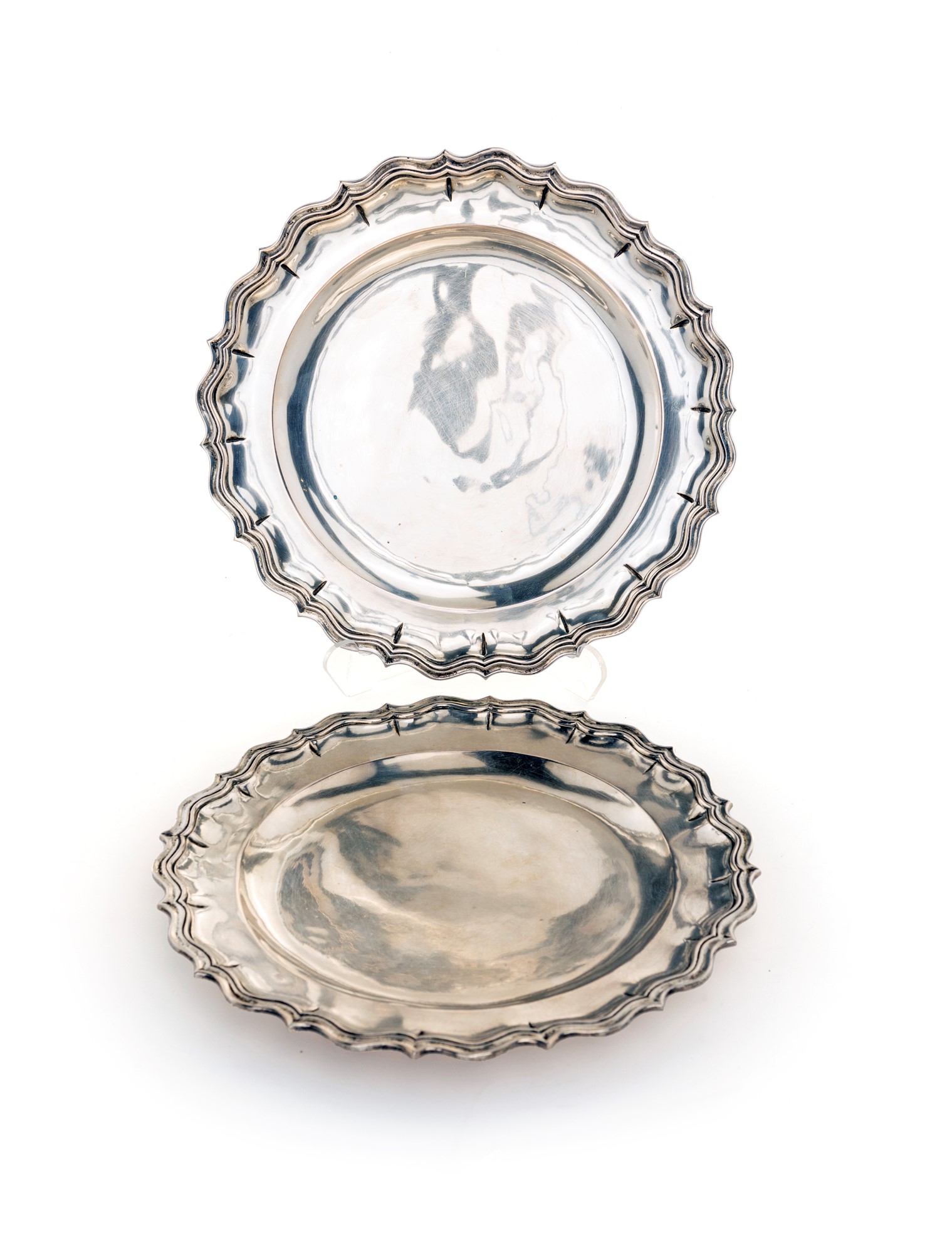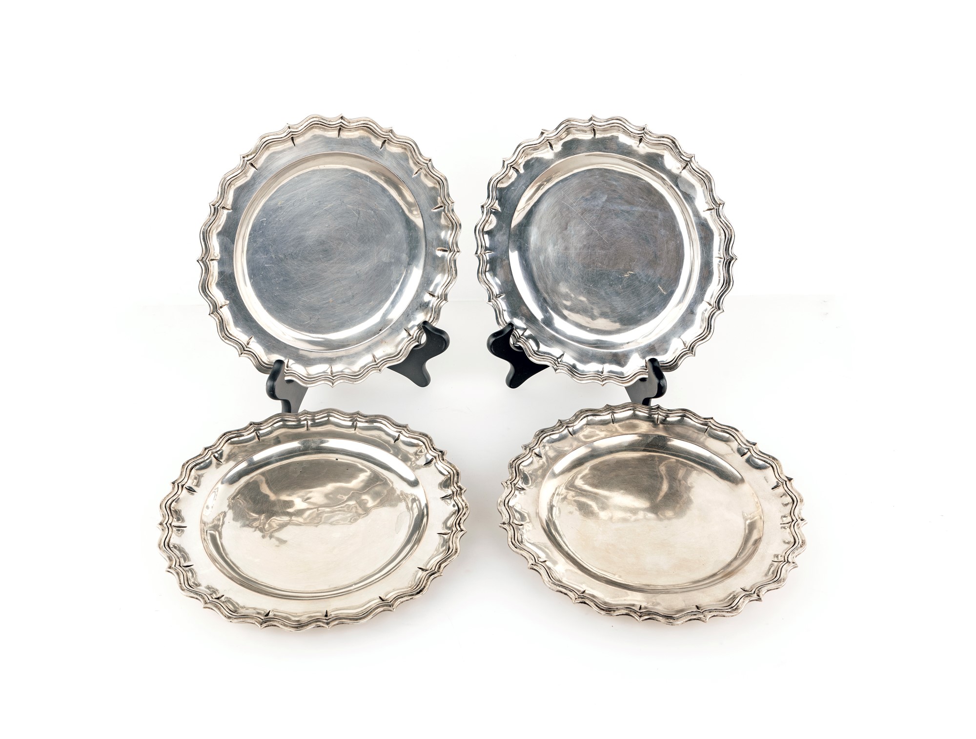 Quattro piatti in argento di forma circolare con orlo sagomato segnato da nervature diametro cm 24,5 - peso complessivo gr. 1642